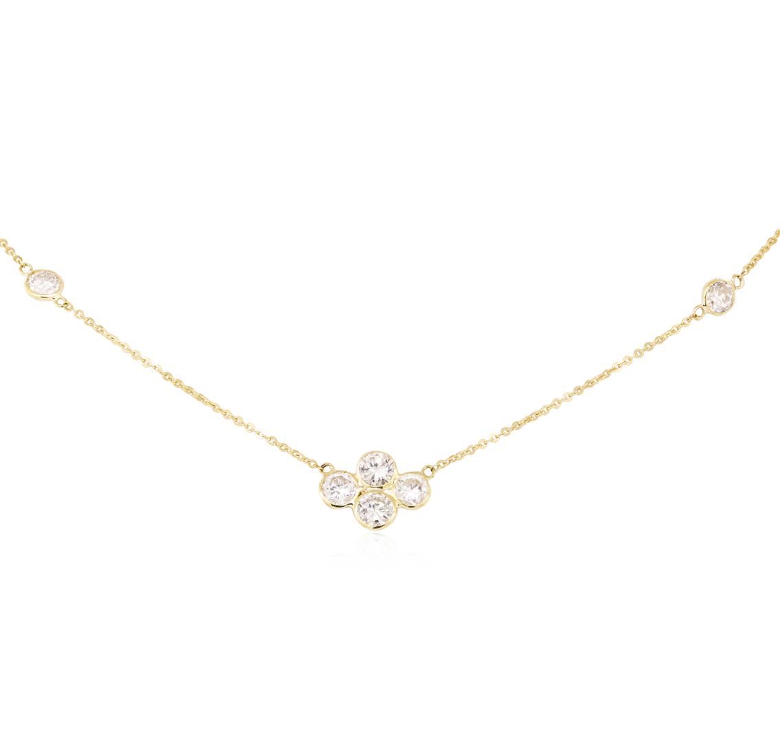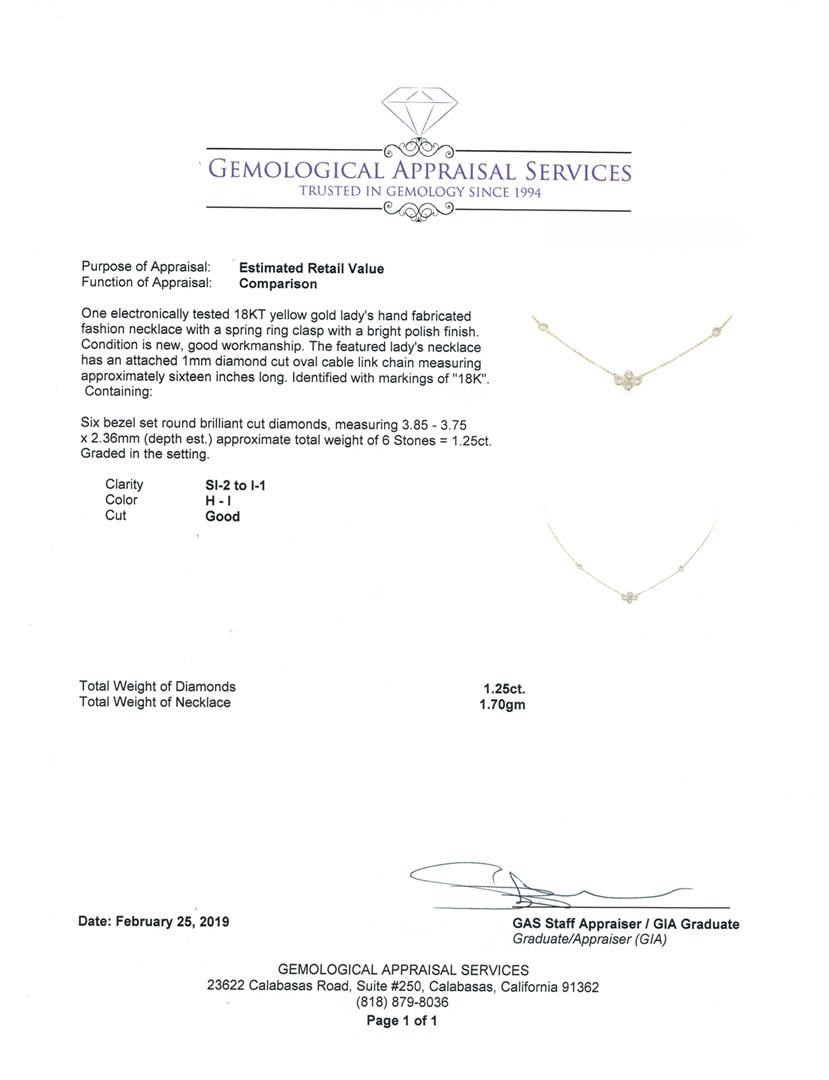One electronically tested 18KT yellow gold lady's hand fabricated fashion necklace with a spring ring clasp with a bright polish finish. The featured lady's necklace has an attached 1mm diamond cut oval cable link chain measuring approximately sixteen inches long. Identified with markings of '18K'. Condition is new, good workmanship. Containing: Six bezel set round brilliant cut diamonds, measuring 3.85 - 3.75 x 2.36mm (depth est.) approximate total weight of 6 Stones = 1.25ct. Graded in the setting. Color H - I, Clarity SI-2 to I-1, Cut Good. Total Weight of Diamonds 1.25ct. Total Weight of Necklace 1.70gm. GAS Appraised.