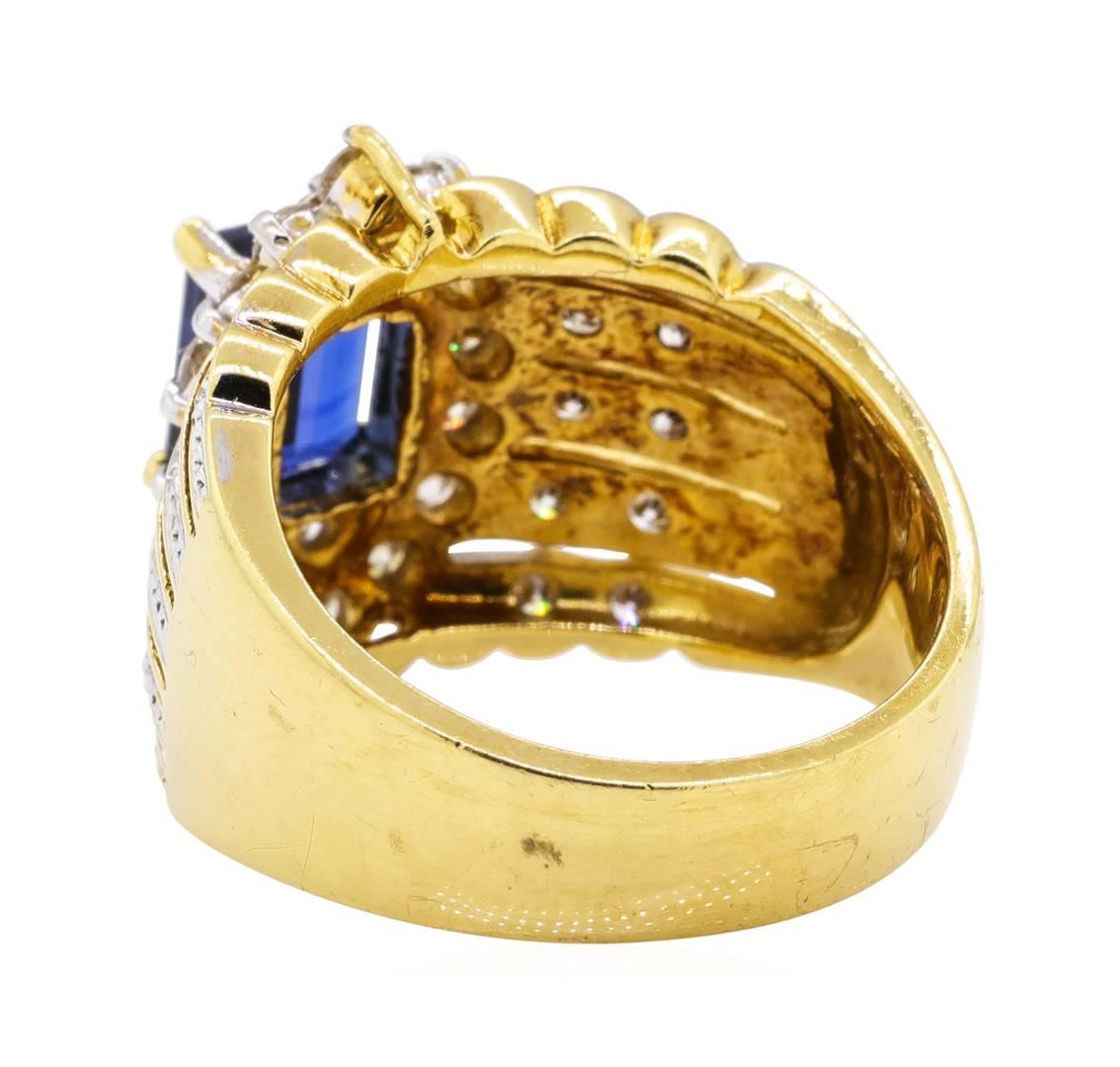 One electronically tested 18KT yellow gold ladies cast fashion ring with a five row wide band with a bright polish finish. The featured ladies ring has a shank measuring 5.25 millimeters wide. Trademark is Le Vian. Identified with markings of "18K". Condition is new, good workmanship. Containing: One prong set emerald standard step cut natural blue sapphire, measuring 8.03 x 5.97 x 3.06mm, (depth est.) approximate weight of 1.58ct., clarity is slightly included, medium dark, strong, blue color, (GIA B 6/5), cut is very good. Colored gemstones are presumed to have been subjected to commonly used enhancement processes. Graded in the setting. Fourteen prong set round brilliant cut diamonds, measuring 2.15 - 2.10 x 1.32mm (depth est.) approximate total weight of 14 Stones = 0.50ct. Graded in the setting. Color H - I Clarity VS-2 to SI-1 Cut Good Twenty-Two prong set round brilliant cut diamonds, measuring 1.60 - 1.50 x 0.96mm (depth est.) approximate total weight of 22 Stones = 0.30ct. Graded in the setting. Color H - I Clarity VS-2 to SI-1 Cut Good. Total Weight of Colored Stones 1.58ct. Total Weight of Diamonds 0.80ct. Total Weight of Ring 10.50gm. GAS Appraised.