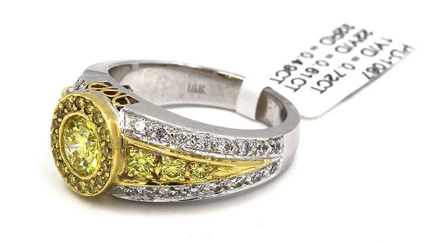 One Fancy Yellow Round Cut Diamond Engagement Halo Ring Wedding in 18k Yellow & White Gold. Total carat weight is 1.82 carats. Metal is two-tone. Gross weight is 10.61 grams. Size is 6.75 but can be resized free of charge. Condition is brand new. Main diamond is 0.72 carats. Shape is round cut, clarity is SI1-SI2, color is natural fancy yellow, and cut is very good. Side diamonds total carats is 1.10 carats, shape fancy yellow brilliant round cut, clarity SI1- SI2, color G-H, and cut is very good with a total of 54 side diamonds.
