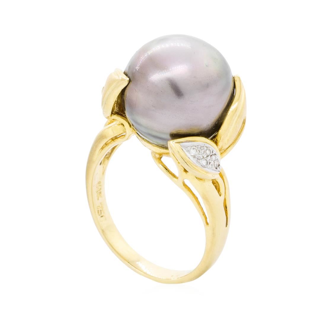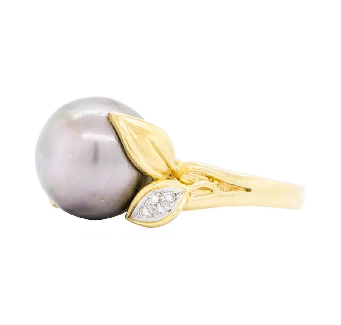 One lady's ring featuring: 18KT yellow gold weighing 9.7 grams containing one Tahitian pearl measuring 13.20mm and diamonds weighing 0.05ctw. The ring is a size 6.5.