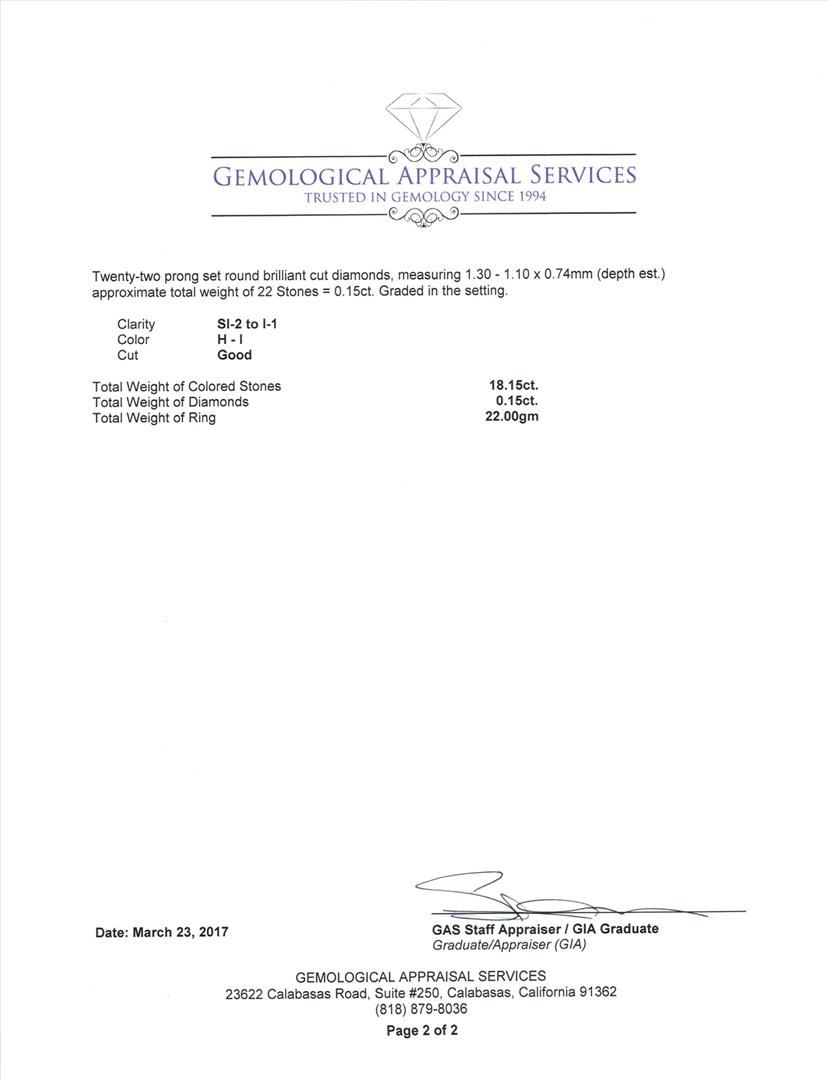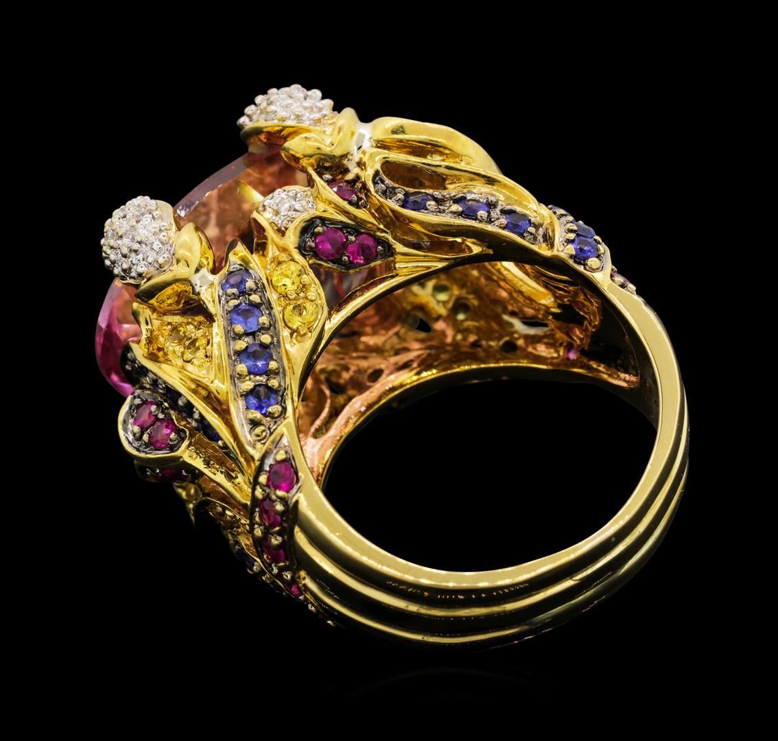 One electronically tested 18KT yellow gold lady's combination cast & assembled fashion floral design ring with a triple shank with a bright polish finish. The featured lady's ring has a triple shank measuring 5.39 millimeters wide. Identified with markings of "18K 750". Condition is like new, good workmanship. Containing: One prong set oval modified brilliant cut natural pink topaz, measuring 18.10 x 13.33 x 8.91mm, (depth est.) approximate weight of 16.05ct., clarity is eye clean, medium, moderately strong, strongly purplish red color, (GIA stpR 5/4), cut is very good. Transmitting light with no distortion, transparent. Colored gemstones are presumed to have been subjected to commonly used enhancement processes. Graded in the setting. Twenty-eight prong set round modified brilliant cut natural blue sapphires, measuring 1.80 - 1.70 x 1.14 mm, (depth est.) approximate. Total Weight of 0.84ct., clarity is slightly included, medium dark, moderately strong, blue color, (GIA B 6/4), cut is good. Transmitting light with a minimum of distortion, transparent. Colored gemstones are presumed to have been subjected to commonly used enhancement processes. Graded in the setting. Twenty-four prong set round modified brilliant cut natural rubies, measuring 1.80 - 1.70 x 1.14 mm, (depth est.) approximate. Total Weight of 0.72ct., clarity is moderately included, medium, moderately strong, slightly purplish red color, (GIA slpR 5/4), cut is good. Transmitting light somewhat diffusely, transparent to translucent. Colored gemstones are presumed to have been subjected to commonly used enhancement processes. Graded in the setting. Eighteen prong set round modified brilliant cut natural yellow sapphires, measuring 1.80 - 1.70 x 1.14 mm, (depth est.) approximate. Total Weight of 0.54ct., clarity is slightly included, medium, moderately strong, yellow color, (GIA Y 5/4), cut is good. Transmitting light with a minimum of distortion, transparent. Colored gemstones are presumed to have been subjected to commonly used enhancement processes. Graded in the setting. Twenty-Two prong set round brilliant cut diamonds, measuring 1.30 - 1.10 x 0.74mm (depth est.) approximate. Total Weight of 22 Stones = 0.15ct. Graded in the setting. Color H - I Clarity SI-2 to I-1 Cut Good. Total Weight of Colored Stones 18.15ct.. Total Weight of Diamonds 0.15ct.. Total Weight of Ring 22.00gm. GAS Appraised.
