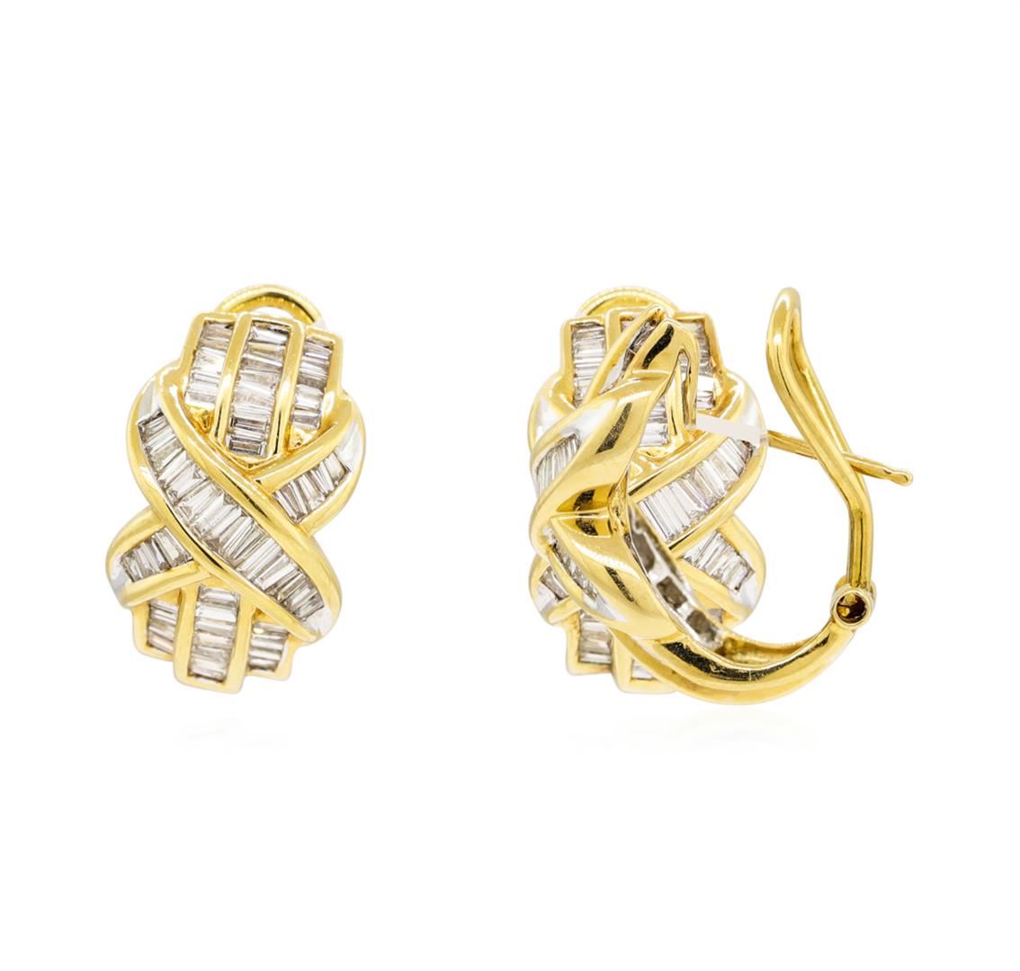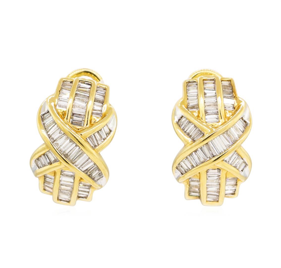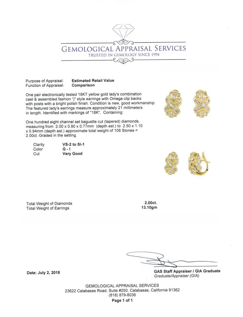 One pair electronically tested 18KT yellow gold lady's combination cast & assembled fashion 'j' style earrings with Omega clip backs with posts with a bright polish finish. The featured lady's earrings measure approximately 21 millimeters in length. Identified with markings of '18K'. Condition is new, good workmanship. Containing: One Hundred Eight channel set baguette cut (tapered) diamonds, measuring from 2.00 x 0.90 x 0.77mm (depth est.) to 2.50 x 1.10 x 0.94mm (depth est.) approximate total weight of 108 Stones = 2.00ct. Graded in the setting. Color G - I Clarity VS-2 to SI-1 Cut Very Good. Total Weight of Diamonds 2.00ct. Total Weight of Earrings 13.10gm. GAS Appraised.