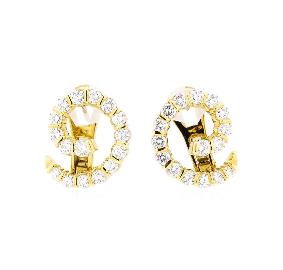 One pair electronically tested 18KT yellow gold Ladies combination cast & assembled fashion swirl earrings with hinged clip backs with a bright polish finish. Identified with markings of '18KP'. Condition is new, good workmanship. Containing: Thirty-Two channel set round brilliant cut diamonds, measuring 3.00 - 2.20 x 1.61mm (depth est.) approximate total weight of 32 Stones = 2.00ct. Graded in the setting. Color G - H Clarity VVS-2 to VS-1 Cut Excellent. Total Weight of Diamonds 2.00ct.. Total Weight of Earrings 9.20gm. GAS Appraised.