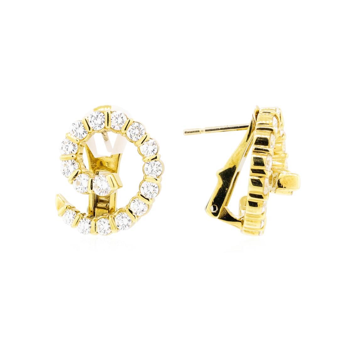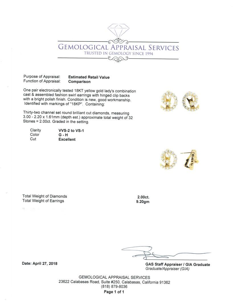 One pair electronically tested 18KT yellow gold Ladies combination cast & assembled fashion swirl earrings with hinged clip backs with a bright polish finish. Identified with markings of '18KP'. Condition is new, good workmanship. Containing: Thirty-Two channel set round brilliant cut diamonds, measuring 3.00 - 2.20 x 1.61mm (depth est.) approximate total weight of 32 Stones = 2.00ct. Graded in the setting. Color G - H Clarity VVS-2 to VS-1 Cut Excellent. Total Weight of Diamonds 2.00ct.. Total Weight of Earrings 9.20gm. GAS Appraised.