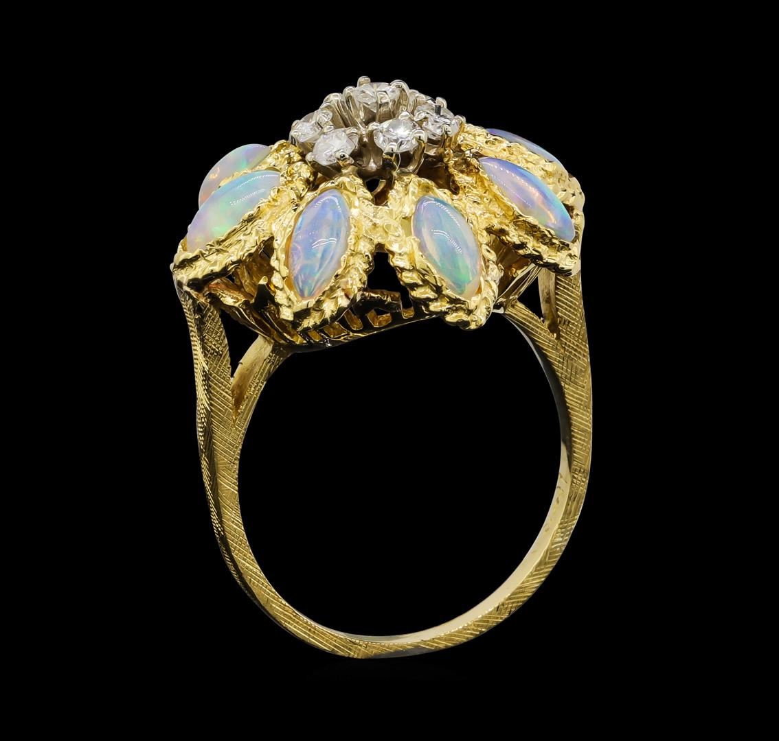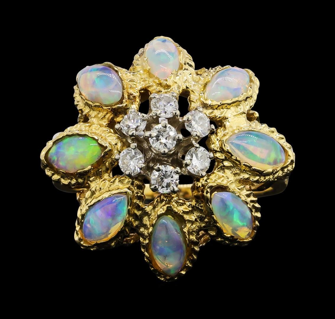 One Ladies fashion ring featuring: 18KT yellow gold weighing 7.0 grams containing eight opals weighing 1.60ctw and diamonds weighing 0.28ctw.