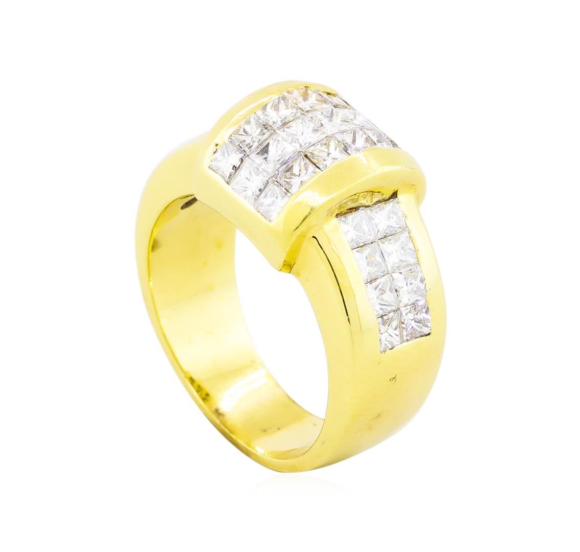 One electronically tested 18KT yellow gold lady's cast fashion ring with a bright polish finish. The featured lady's ring has a shank measuring 5.02 millimeters wide. Condition is like new, good workmanship. Containing: Thirty-Four invisible set princess cut diamonds, measuring 2.20 x 2.10 x 1.58mm (depth est.) approximate. Total Weight of 34 Stones = 2.03ct. Graded in the setting. Clarity: VS-1 to SI-1. Color: G - I, Cut Good. Total Weight of Diamonds 2.03ct. Total Weight of Ring 12.20gm. GAS Appraised at $7,680.00.