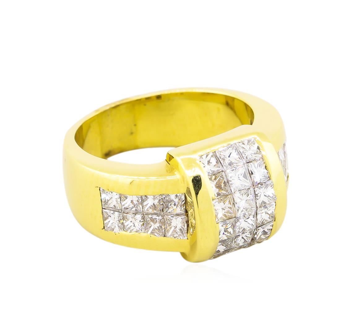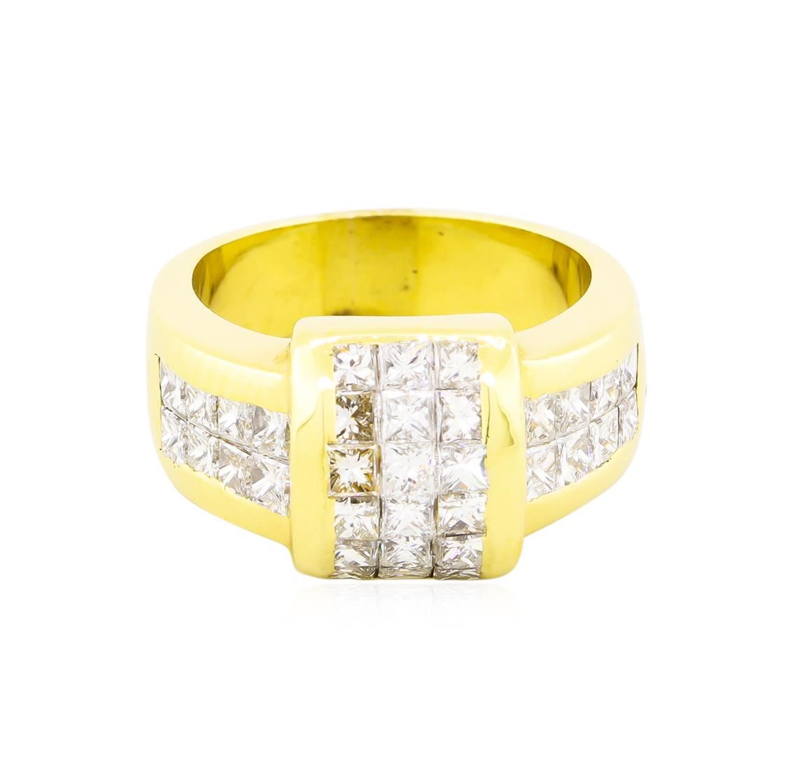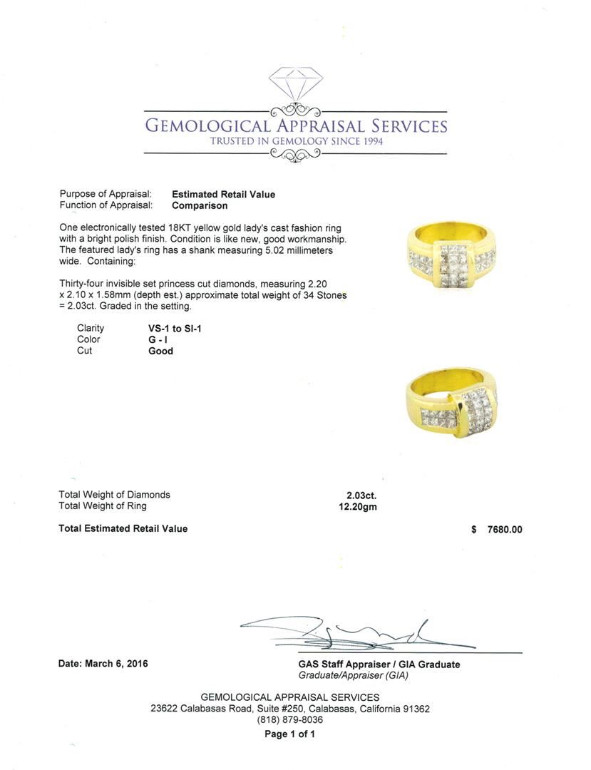 One electronically tested 18KT yellow gold lady's cast fashion ring with a bright polish finish. The featured lady's ring has a shank measuring 5.02 millimeters wide. Condition is like new, good workmanship. Containing: Thirty-Four invisible set princess cut diamonds, measuring 2.20 x 2.10 x 1.58mm (depth est.) approximate. Total Weight of 34 Stones = 2.03ct. Graded in the setting. Clarity: VS-1 to SI-1. Color: G - I, Cut Good. Total Weight of Diamonds 2.03ct. Total Weight of Ring 12.20gm. GAS Appraised at $7,680.00.