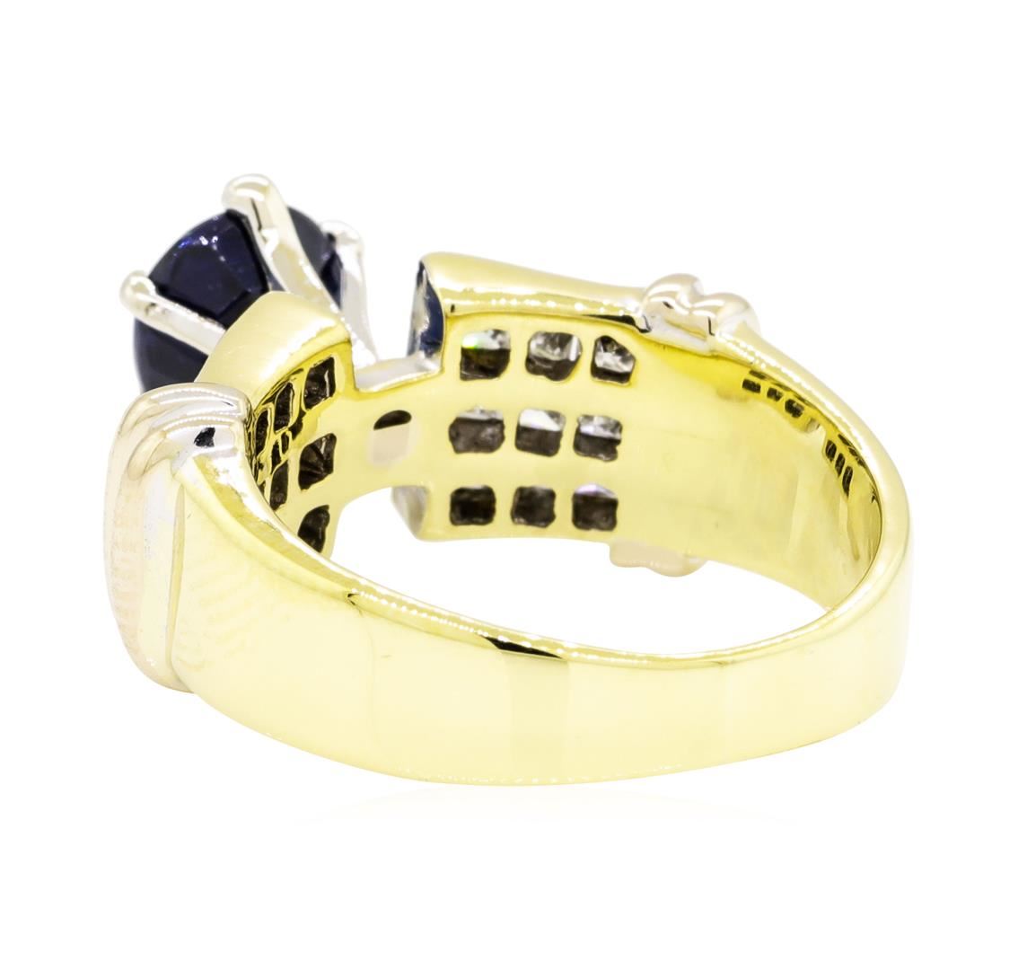 One electronically tested 18KT yellow gold lady's combination cast & assembled fashion ring with a bright polish finish. The featured lady's ring has a shank measuring 3.30 millimeters wide. Identified with markings of '18K'. Condition is used, good workmanship. Containing: One prong set pear modified mixed cut natural blue sapphire, measuring 8.70 x 6.35 x 4.55mm, (depth est.) 7%. bulge factor, approximate weight of 2.20ct., clarity is slightly included, dark, moderately strong, blue color, (GIA B 7/4), cut is good. Transmitting light with a minimum of distortion, transparent. Colored gemstones are presumed to have been subjected to commonly used enhancement processes. Graded in the setting. Eighteen invisible set princess cut diamonds, measuring 2.20 x 2.00 x 1.50mm (depth est.) approximate total weight of 18 Stones = 1.00ct. Graded in the setting. Color G - H Clarity VS-2 to SI-1 Cut Very Good. Total Weight of Colored Stones 2.20ct.. Total Weight of Diamonds 1.00ct.. Total Weight of Ring 8.30gm. GAS Appraised.