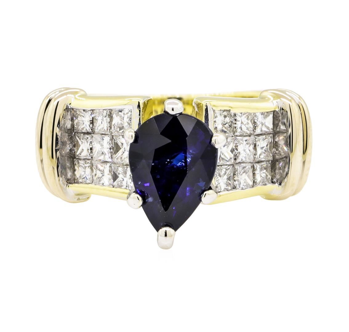 One electronically tested 18KT yellow gold lady's combination cast & assembled fashion ring with a bright polish finish. The featured lady's ring has a shank measuring 3.30 millimeters wide. Identified with markings of '18K'. Condition is used, good workmanship. Containing: One prong set pear modified mixed cut natural blue sapphire, measuring 8.70 x 6.35 x 4.55mm, (depth est.) 7%. bulge factor, approximate weight of 2.20ct., clarity is slightly included, dark, moderately strong, blue color, (GIA B 7/4), cut is good. Transmitting light with a minimum of distortion, transparent. Colored gemstones are presumed to have been subjected to commonly used enhancement processes. Graded in the setting. Eighteen invisible set princess cut diamonds, measuring 2.20 x 2.00 x 1.50mm (depth est.) approximate total weight of 18 Stones = 1.00ct. Graded in the setting. Color G - H Clarity VS-2 to SI-1 Cut Very Good. Total Weight of Colored Stones 2.20ct.. Total Weight of Diamonds 1.00ct.. Total Weight of Ring 8.30gm. GAS Appraised.