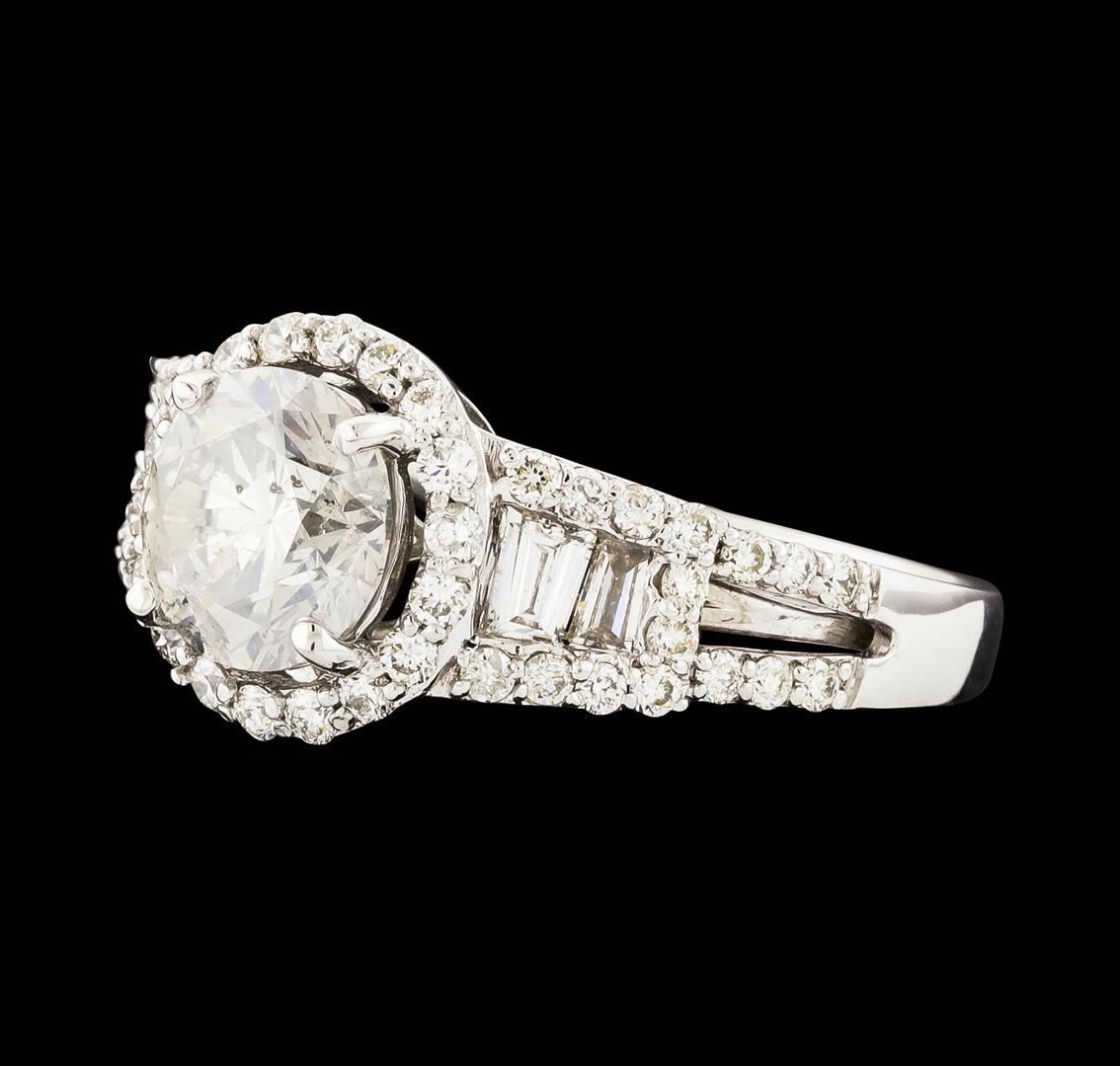 One electronically tested 18KT white gold ladies cast diamond unity ring with a bright polish finish. The featured diamond is set within a diamond bezel supported by elaborate diamond set shoulders, completed by a two millimeter wide band. Trademark is Orianne. Identified with markings of "18K". Condition is new, good workmanship. Containing: One prong set round brilliant cut diamond, measuring 7.15 - 7.14 x 4.62mm (depth est.) approximate weight of 1.54ct with a faint blue fluorescence. Graded in the setting. Clarity: I-1. Color: IDepth 64.6%. Table 57.3%. Fifty-Four prong & channel set round brilliant & baguette cut diamonds approximate total weight of 54 Stones = 0.80ct. Graded in the setting. Clarity: VS-2 to SI-2. Color: G - H. Total Weight of Diamonds 2.34ct. Total Weight of Ring 4.05gm. AIG Appraised at $19,320.00.