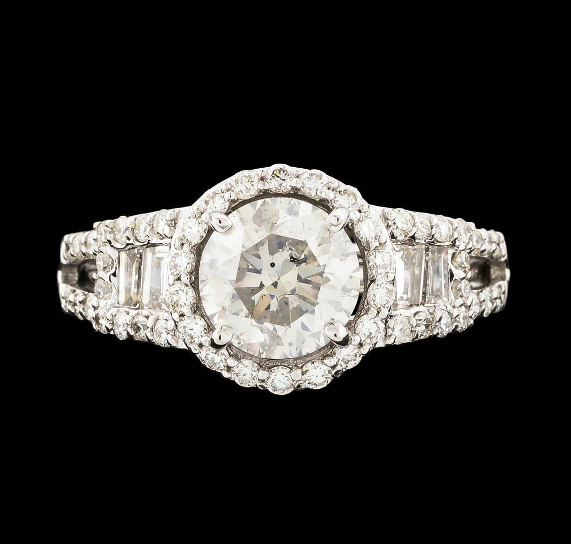 One electronically tested 18KT white gold ladies cast diamond unity ring with a bright polish finish. The featured diamond is set within a diamond bezel supported by elaborate diamond set shoulders, completed by a two millimeter wide band. Trademark is Orianne. Identified with markings of "18K". Condition is new, good workmanship. Containing: One prong set round brilliant cut diamond, measuring 7.15 - 7.14 x 4.62mm (depth est.) approximate weight of 1.54ct with a faint blue fluorescence. Graded in the setting. Clarity: I-1. Color: IDepth 64.6%. Table 57.3%. Fifty-Four prong & channel set round brilliant & baguette cut diamonds approximate total weight of 54 Stones = 0.80ct. Graded in the setting. Clarity: VS-2 to SI-2. Color: G - H. Total Weight of Diamonds 2.34ct. Total Weight of Ring 4.05gm. AIG Appraised.