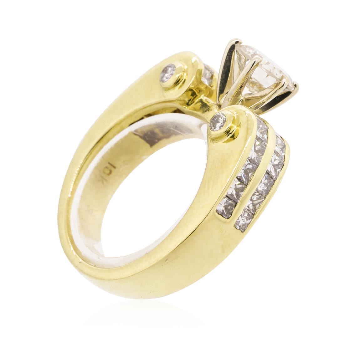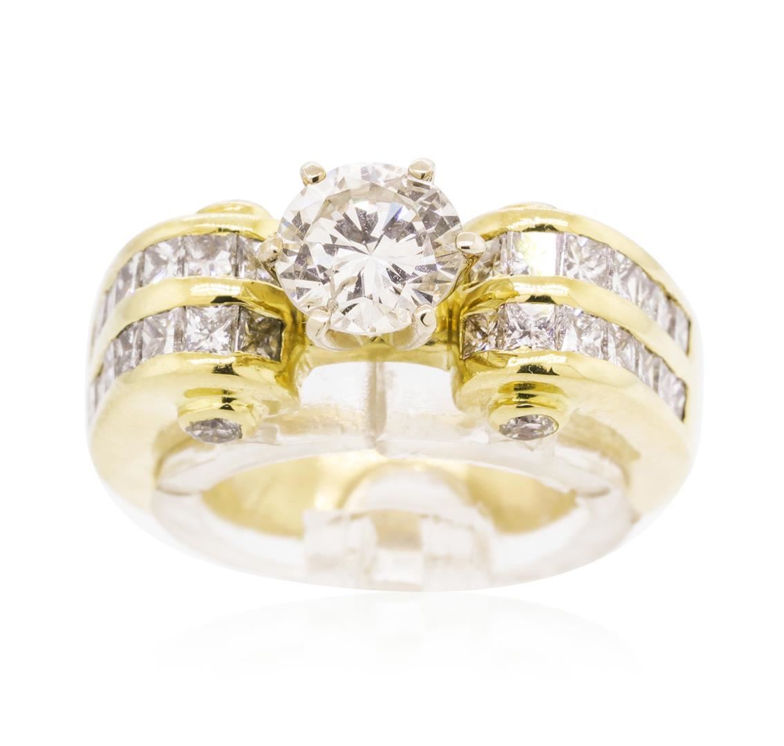 One electronically tested 18KT yellow gold Ladies combination cast & assembled wedding ring with a double row raised shoulders motif with a bright polish finish. The featured Ladies ring has a shank measuring 4.00 millimeters wide. Identified with markings of '18K'. Condition is like new, good workmanship. Containing: One prong set round brilliant cut diamond, measuring 6.40 - 6.35 x 4.05mm (depth est.) approximate weight of 1.03ct. Graded in the setting. Color H - I Clarity I-1 Cut Good Twenty-Eight channel set princess cut diamonds, measuring 2.00 x 2.00 x 1.50mm (depth est.) approximate total weight of 28 Stones = 1.38ct. Graded in the setting. Color H - I Clarity VS-2 to SI-1 Cut Good Four bezel set round brilliant cut diamonds, measuring 2.10 - 2.00 x 1.27mm (depth est.) approximate total weight of 4 Stones = 0.13ct. Graded in the setting. Color G - H Clarity SI-1 to SI-2 Cut Good. Total Weight of Diamonds 2.54ct. Total Weight of Ring 9.80gm. GAS Appraised.