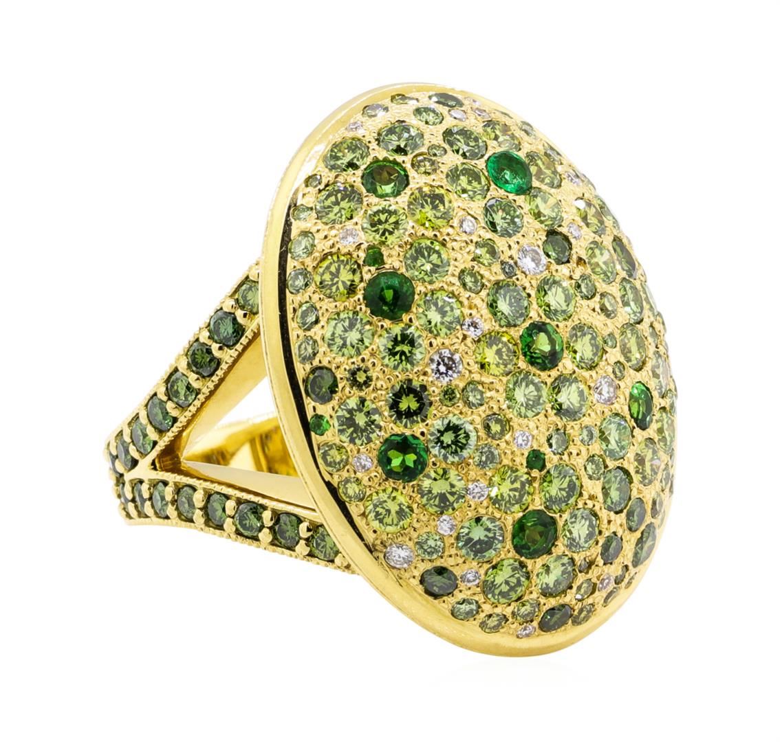 One electronically tested 18KT yellow gold lady's cast fashion designer ring with a split shank dome with a bright polish with milgrain detailing finish. The featured lady's ring is the Leotar ring from Misahara and has a shank measuring 3.76 millimeters wide. Trademark is Misahara. Identified with markings of '750'. Condition is new, good workmanship. Containing: Six prong set round modified mixed cut natural tsavorite garnets, measuring 2.30 - 2.10 x 0.00 mm, (depth est.) approximate total weight of 0.25ct., clarity is eye clean, medium dark, moderately strong, green color, (GIA G 6/4), cut is good. Transmitting light with no distortion, transparent. Colored gemstones are presumed to have been subjected to commonly used enhancement processes. Graded in the setting. One prong set round modified mixed cut natural emerald, measuring 2.30 - 2.25 x 1.48 mm, (depth est.) approximate weight of 0.04ct., clarity is moderately included, medium dark, moderately strong, green color, (GIA G 6/4), cut is good. Transmitting light somewhat diffusely, transparent to translucent. Indications of oil residue. Naturally occurring internal & external characteristics are present. Colored gemstones are presumed to have been subjected to commonly used enhancement processes. Graded in the setting. One Hundred Thirty-Seven prong set round brilliant cut treated diamonds, measuring 2.30 - 1.00 x 1.02mm (depth est.) approximate total weight of 137 Stones = 2.31ct. Colored gemstones are presumed to have been subjected to commonly used enhancement processes. The featured colored diamonds range in color from fancy dark yellowish green to fancy light yellowish green. Color Fancy Dark Yellowish Green Clarity VS-1 to SI-1 Cut Very Good Twenty-Six prong set round brilliant cut diamonds, measuring 1.50 - 0.80 x 0.71mm (depth est.) approximate total weight of 26 Stones = 0.15ct. Graded in the setting. Color F - G Clarity VS-1 to VS-2 Cut Very Good Three prong set round modified mixed cut natural tsavorite garnets, measuring 1.20 - 1.10 x 0.75 mm, (depth est.) approximate total weight of 0.03ct., clarity is eye clean, medium dark, moderately strong, green color, (GIA G 6/4), cut is good. Transmitting light with no distortion, transparent. Colored gemstones are presumed to have been subjected to commonly used enhancement processes. Graded in the setting. Total Weight of Colored Stones 0.32ct. Total Weight of Diamonds 2.46ct. Total Weight of Ring 18.80gm. GAS Appraised.