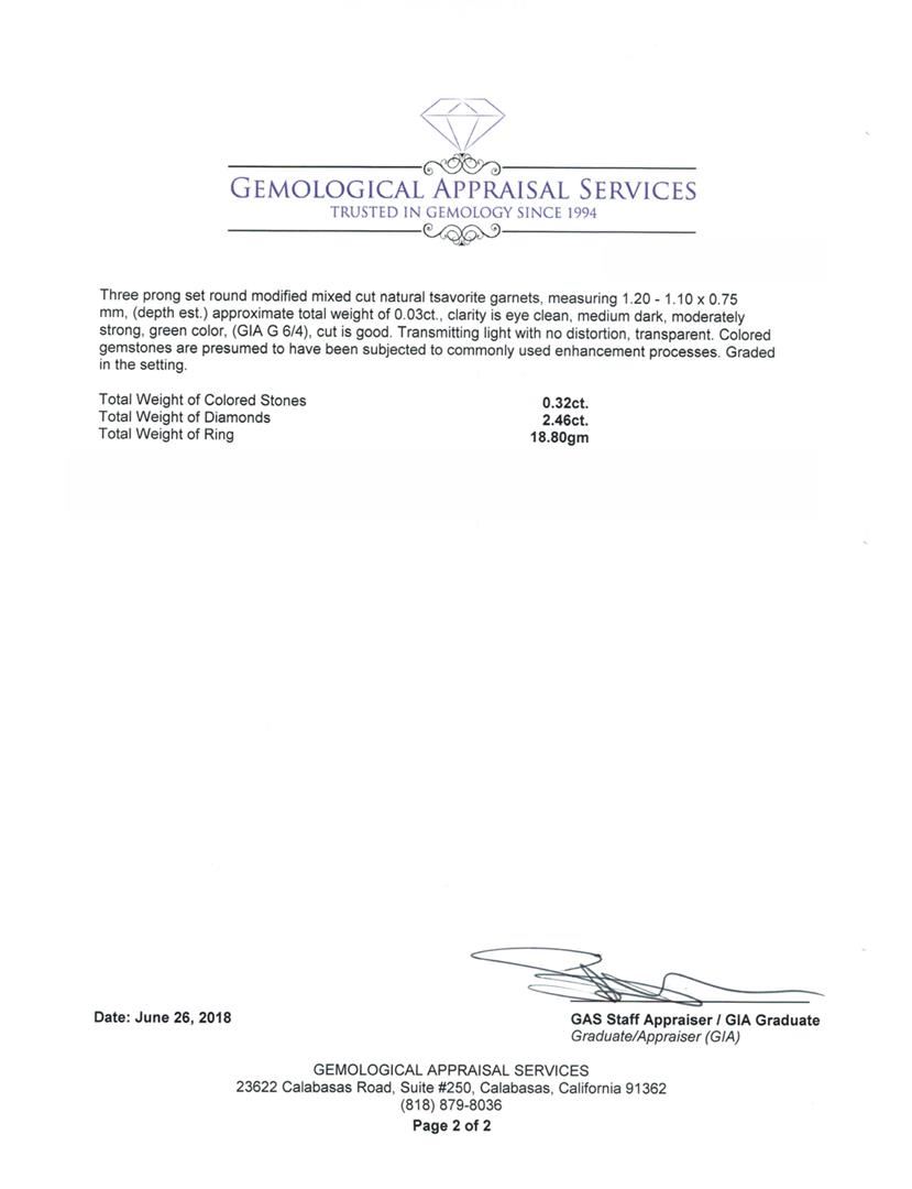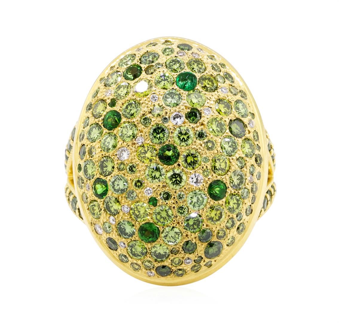 One electronically tested 18KT yellow gold lady's cast fashion designer ring with a split shank dome with a bright polish with milgrain detailing finish. The featured lady's ring is the Leotar ring from Misahara and has a shank measuring 3.76 millimeters wide. Trademark is Misahara. Identified with markings of '750'. Condition is new, good workmanship. Containing: Six prong set round modified mixed cut natural tsavorite garnets, measuring 2.30 - 2.10 x 0.00 mm, (depth est.) approximate total weight of 0.25ct., clarity is eye clean, medium dark, moderately strong, green color, (GIA G 6/4), cut is good. Transmitting light with no distortion, transparent. Colored gemstones are presumed to have been subjected to commonly used enhancement processes. Graded in the setting. One prong set round modified mixed cut natural emerald, measuring 2.30 - 2.25 x 1.48 mm, (depth est.) approximate weight of 0.04ct., clarity is moderately included, medium dark, moderately strong, green color, (GIA G 6/4), cut is good. Transmitting light somewhat diffusely, transparent to translucent. Indications of oil residue. Naturally occurring internal & external characteristics are present. Colored gemstones are presumed to have been subjected to commonly used enhancement processes. Graded in the setting. One Hundred Thirty-Seven prong set round brilliant cut treated diamonds, measuring 2.30 - 1.00 x 1.02mm (depth est.) approximate total weight of 137 Stones = 2.31ct. Colored gemstones are presumed to have been subjected to commonly used enhancement processes. The featured colored diamonds range in color from fancy dark yellowish green to fancy light yellowish green. Color Fancy Dark Yellowish Green Clarity VS-1 to SI-1 Cut Very Good Twenty-Six prong set round brilliant cut diamonds, measuring 1.50 - 0.80 x 0.71mm (depth est.) approximate total weight of 26 Stones = 0.15ct. Graded in the setting. Color F - G Clarity VS-1 to VS-2 Cut Very Good Three prong set round modified mixed cut natural tsavorite garnets, measuring 1.20 - 1.10 x 0.75 mm, (depth est.) approximate total weight of 0.03ct., clarity is eye clean, medium dark, moderately strong, green color, (GIA G 6/4), cut is good. Transmitting light with no distortion, transparent. Colored gemstones are presumed to have been subjected to commonly used enhancement processes. Graded in the setting. Total Weight of Colored Stones 0.32ct. Total Weight of Diamonds 2.46ct. Total Weight of Ring 18.80gm. GAS Appraised.