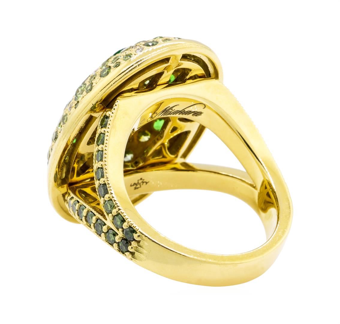 One electronically tested 18KT yellow gold lady's cast fashion designer ring with a split shank dome with a bright polish with milgrain detailing finish. The featured lady's ring is the Leotar ring from Misahara and has a shank measuring 3.76 millimeters wide. Trademark is Misahara. Identified with markings of '750'. Condition is new, good workmanship. Containing: Six prong set round modified mixed cut natural tsavorite garnets, measuring 2.30 - 2.10 x 0.00 mm, (depth est.) approximate total weight of 0.25ct., clarity is eye clean, medium dark, moderately strong, green color, (GIA G 6/4), cut is good. Transmitting light with no distortion, transparent. Colored gemstones are presumed to have been subjected to commonly used enhancement processes. Graded in the setting. One prong set round modified mixed cut natural emerald, measuring 2.30 - 2.25 x 1.48 mm, (depth est.) approximate weight of 0.04ct., clarity is moderately included, medium dark, moderately strong, green color, (GIA G 6/4), cut is good. Transmitting light somewhat diffusely, transparent to translucent. Indications of oil residue. Naturally occurring internal & external characteristics are present. Colored gemstones are presumed to have been subjected to commonly used enhancement processes. Graded in the setting. One Hundred Thirty-Seven prong set round brilliant cut treated diamonds, measuring 2.30 - 1.00 x 1.02mm (depth est.) approximate total weight of 137 Stones = 2.31ct. Colored gemstones are presumed to have been subjected to commonly used enhancement processes. The featured colored diamonds range in color from fancy dark yellowish green to fancy light yellowish green. Color Fancy Dark Yellowish Green Clarity VS-1 to SI-1 Cut Very Good Twenty-Six prong set round brilliant cut diamonds, measuring 1.50 - 0.80 x 0.71mm (depth est.) approximate total weight of 26 Stones = 0.15ct. Graded in the setting. Color F - G Clarity VS-1 to VS-2 Cut Very Good Three prong set round modified mixed cut natural tsavorite garnets, measuring 1.20 - 1.10 x 0.75 mm, (depth est.) approximate total weight of 0.03ct., clarity is eye clean, medium dark, moderately strong, green color, (GIA G 6/4), cut is good. Transmitting light with no distortion, transparent. Colored gemstones are presumed to have been subjected to commonly used enhancement processes. Graded in the setting. Total Weight of Colored Stones 0.32ct. Total Weight of Diamonds 2.46ct. Total Weight of Ring 18.80gm. GAS Appraised.