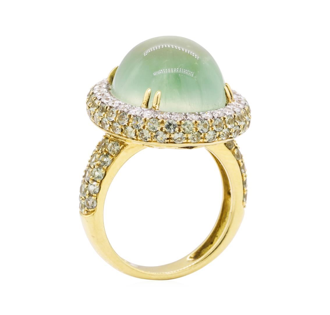 One electronically tested 18KT yellow gold lady's cast fashion ring with a halo with a bright polish finish. The featured lady's ring has a shank measuring 3.40 millimeters wide. Identified with markings of '18K 750'. Condition is like new, good workmanship. Containing: One prong set oval cabochon standard cut natural green tourmaline, measuring 16.00 x 14.70 x 9.65mm, (depth est.) approximate weight of 18.75ct.,, Clarity is moderately included, medium light, very slightly grayish, green color, (GIA G 4/3), cut is very good. Transmitting light somewhat diffusely, transparent to translucent. Colored gemstones are presumed to have been subjected to commonly used enhancement processes. Graded in the setting. Ninety prong set round standard brilliant cut natural green sapphires, measuring 1.90 - 1.60 x 1.14 mm, (depth est.) approximate total weight of 2.70ct.,, Clarity is slightly included, medium light, very slightly grayish, green color, (GIA G 4/3), cut is very good. Transmitting light with a minimum of distortion, transparent. Colored gemstones are presumed to have been subjected to commonly used enhancement processes. Graded in the setting. Thirty prong set round brilliant cut diamonds, measuring 1.65 - 1.60 x 1.01mm (depth est.) approximate total weight of 30 Stones = 0.50ct. Graded in the setting. Color H - I, Clarity SI-2 to I-1, Cut Good. Total Weight of Colored Stones 21.45ct. Total Weight of Diamonds 0.50ct. Total Weight of Ring 11.50gm. GAS Appraised.