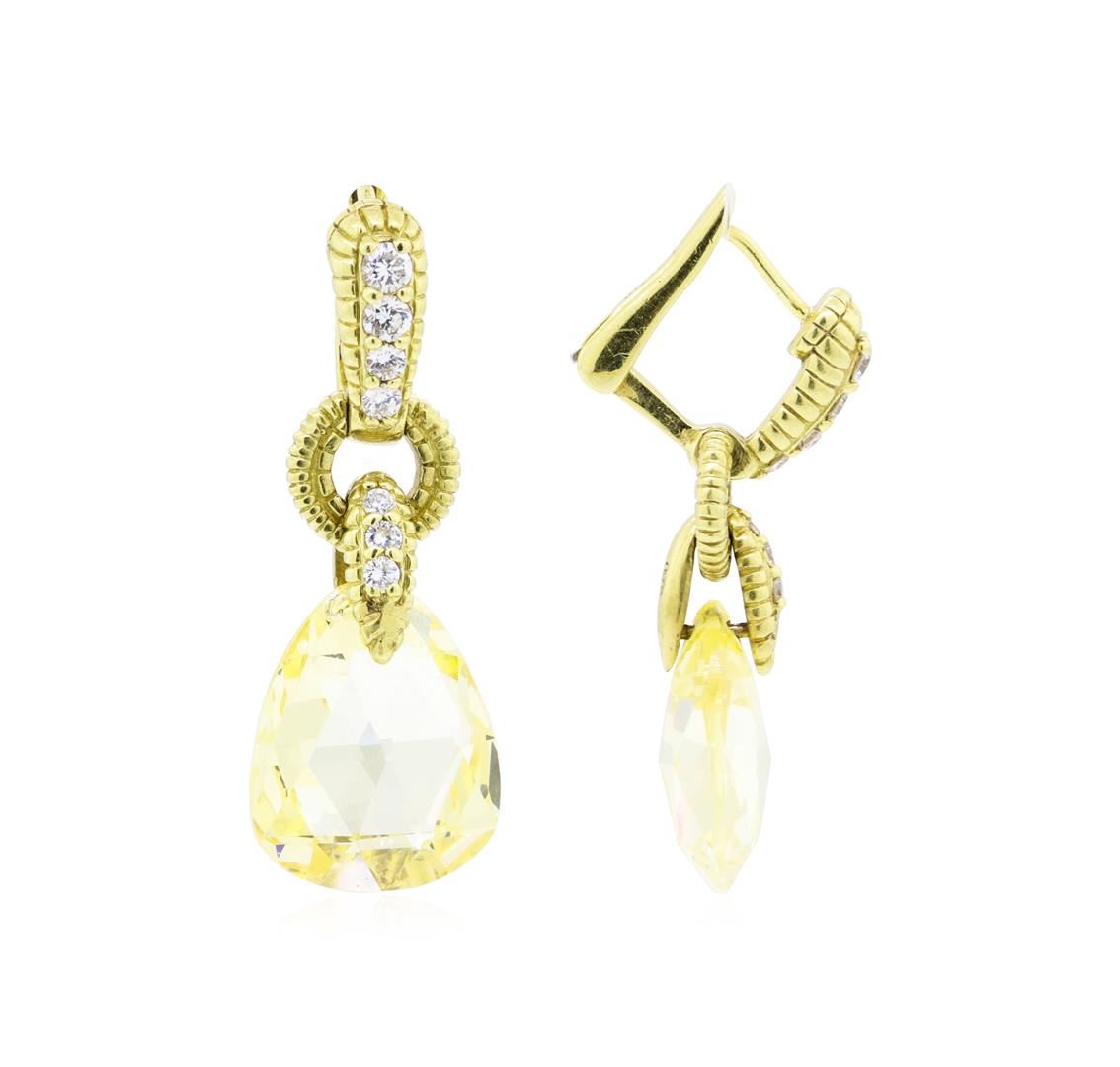 One pair of earrings with hinged clip backs featuring: 18KT yellow gold weighing 9.4 grams containing two yellow topazes weighing 4.50ctw and diamonds weighing 0.20ctw. The earrings have a drop of approximately 30 millimeters.
