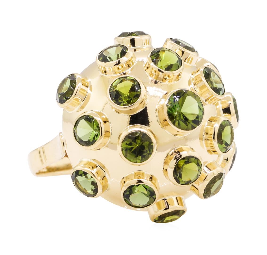 One dome ring featuring: 18KT yellow gold weighing 5.0 grams containing green tourmalines weighing 5.00ctw. The ring is a size 7.