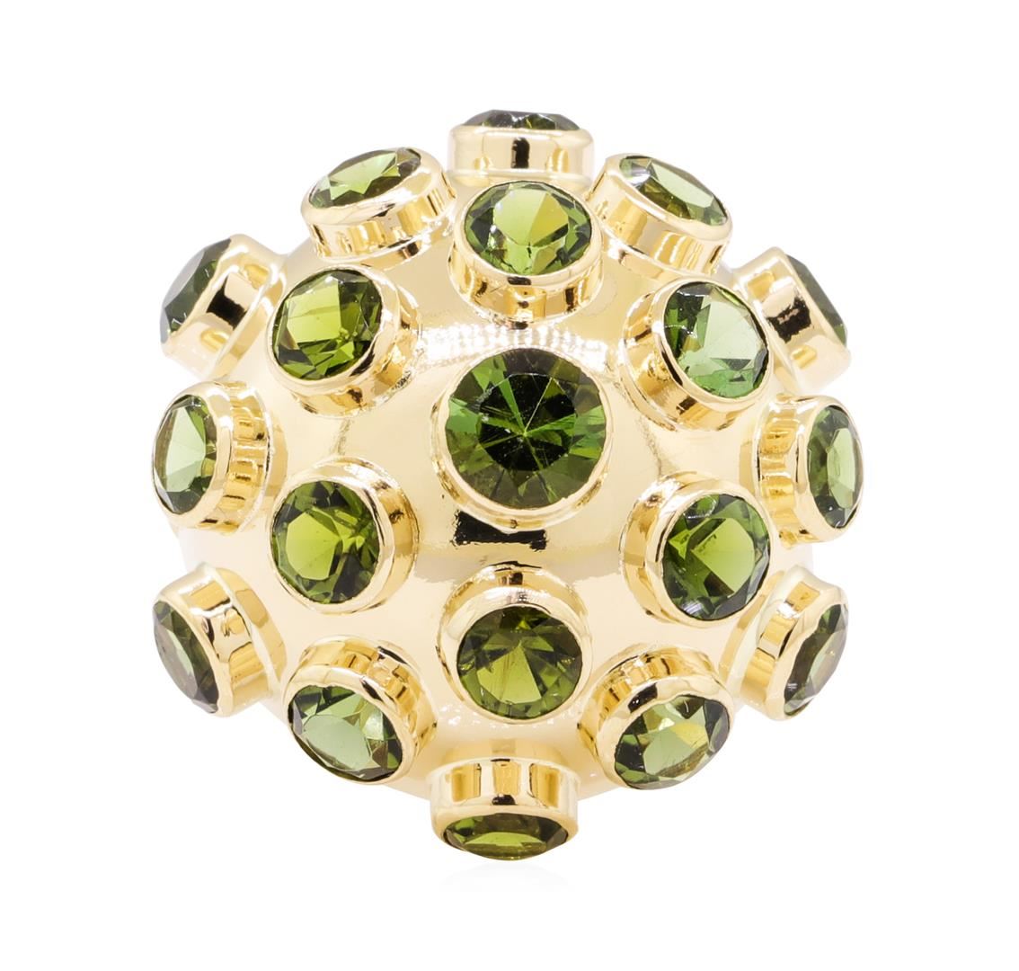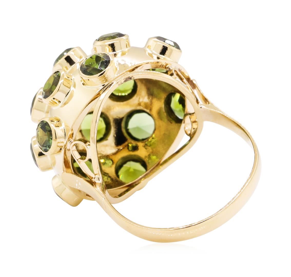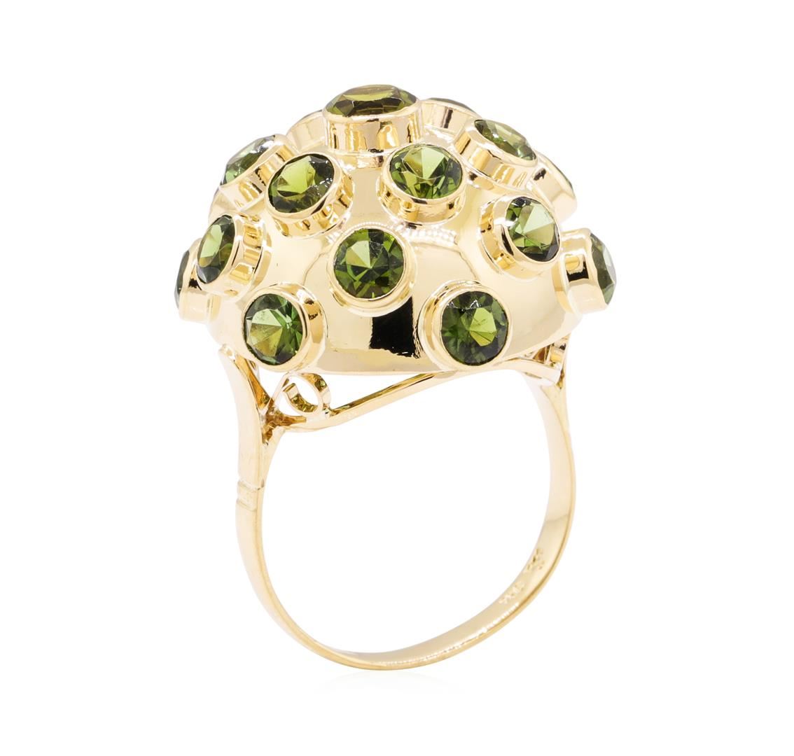 One dome ring featuring: 18KT yellow gold weighing 5.0 grams containing green tourmalines weighing 5.00ctw. The ring is a size 7.