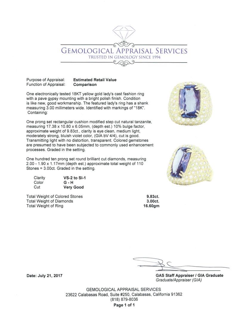 One electronically tested 18KT yellow gold Ladies cast fashion ring with a pave gypsy mounting with a bright polish finish. The featured Ladies ring has a shank measuring 3.00 millimeters wide. Identified with markings of '18K'. Condition is like new, good workmanship. Containing: One prong set rectangular cushion modified step cut natural tanzanite, measuring 17.38 x 10.80 x 6.05mm, (depth est.) 10%. bulge factor, approximate weight of 9.83ct., clarity is eye clean, medium light, moderately strong, bluish violet color, (GIA bV 4/4), cut is good. Transmitting light with no distortion, transparent. Colored gemstones are presumed to have been subjected to commonly used enhancement processes. Graded in the setting. One Hundred Ten prong set round brilliant cut diamonds, measuring 2.00 - 1.90 x 1.17mm (depth est.) approximate total weight of 110 Stones = 3.00ct. Graded in the setting. Color G - H Clarity VS-2 to SI-1 Cut Very Good. Total Weight of Colored Stones 9.83ct. Total Weight of Diamonds 3.00ct. Total Weight of Ring 16.60gm. GAS Appraised.