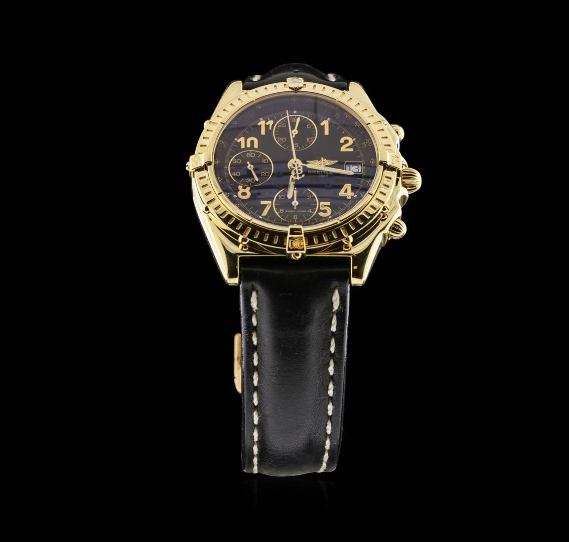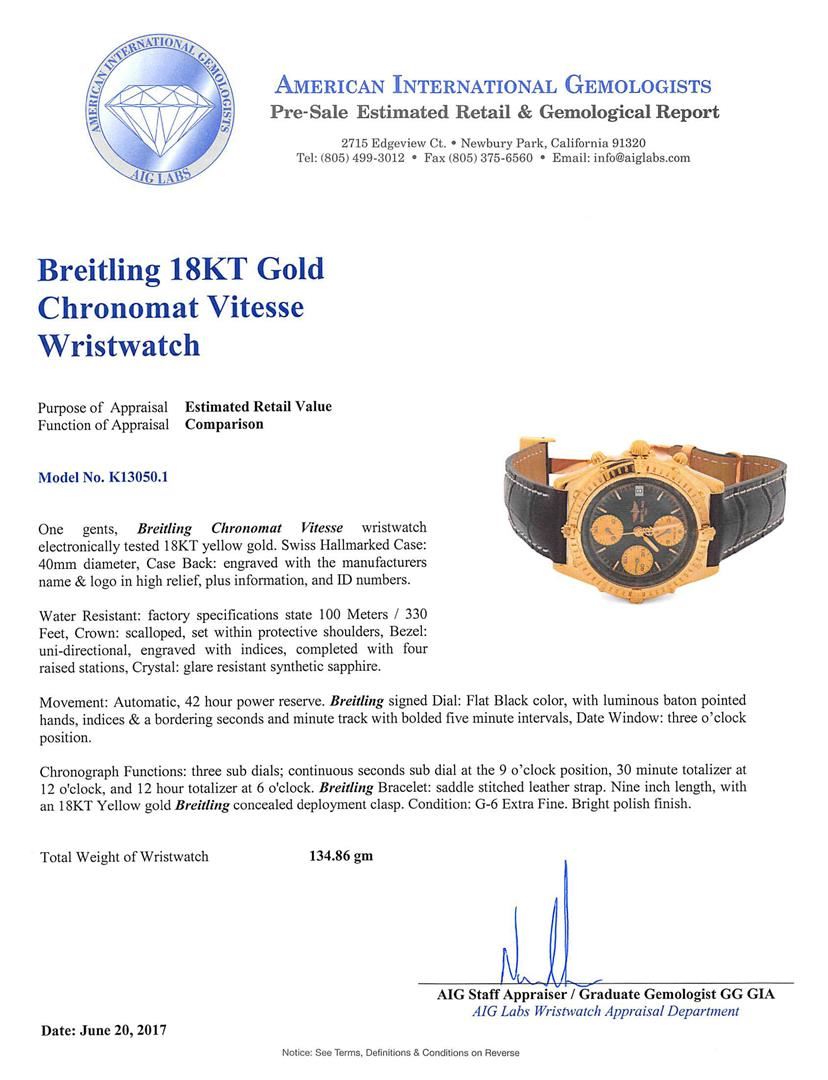 One gents, Breitling Chronomat Vitesse wristwatch electronically tested 18KT yellow gold. Swiss Hallmarked Case: 40mm diameter, Case Back: engraved with the manufacturers name & logo in high relief, plus information, and ID numbers.Water Resistant: factory specifications state 100 Meters / 330 Feet, Crown: scalloped, set within protective shoulders, Bezel: uni-directional, engraved with indices, completed with four raised stations, Crystal: glare resistant synthetic sapphire.Movement: Automatic, 42 hour power reserve. Breitling signed Dial: Flat Black color, with luminous baton pointed hands, indices & a bordering seconds and minute track with bolded five minute intervals, Date Window: three o'clock position.Chronograph Functions: three sub dials; continuous seconds sub dial at the 9 o'clock position, 30 minute totalizer at 12 o'clock, and 12 hour totalizer at 6 o'clock. Breitling Bracelet: saddle stitched leather strap. Nine inch length, with an 18KT Yellow gold Breitling concealed deployment clasp. Condition: G-6 Extra Fine. Bright polish finish. Total Weight of Wristwatch 134.86gm. AIG Appraised.