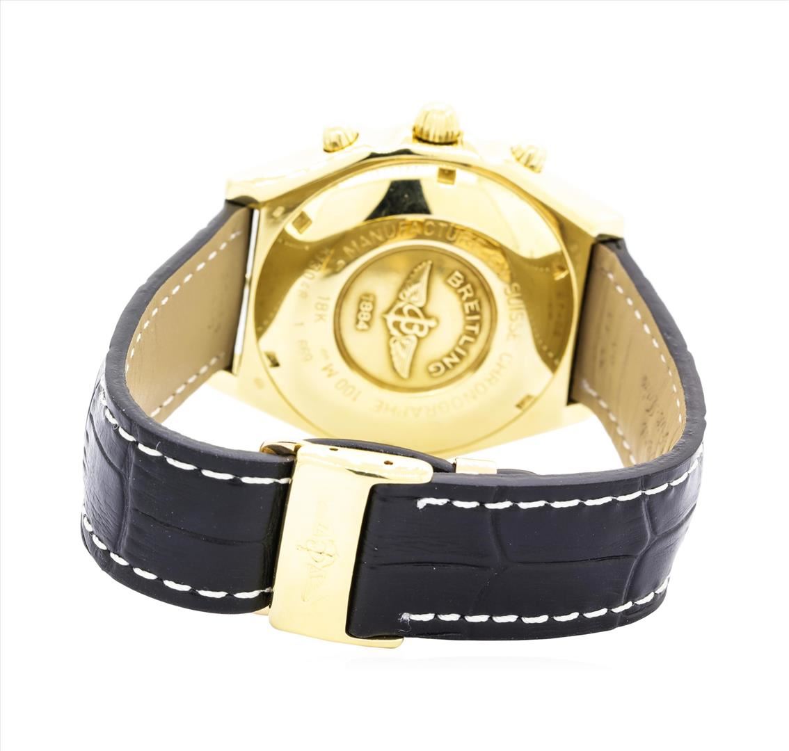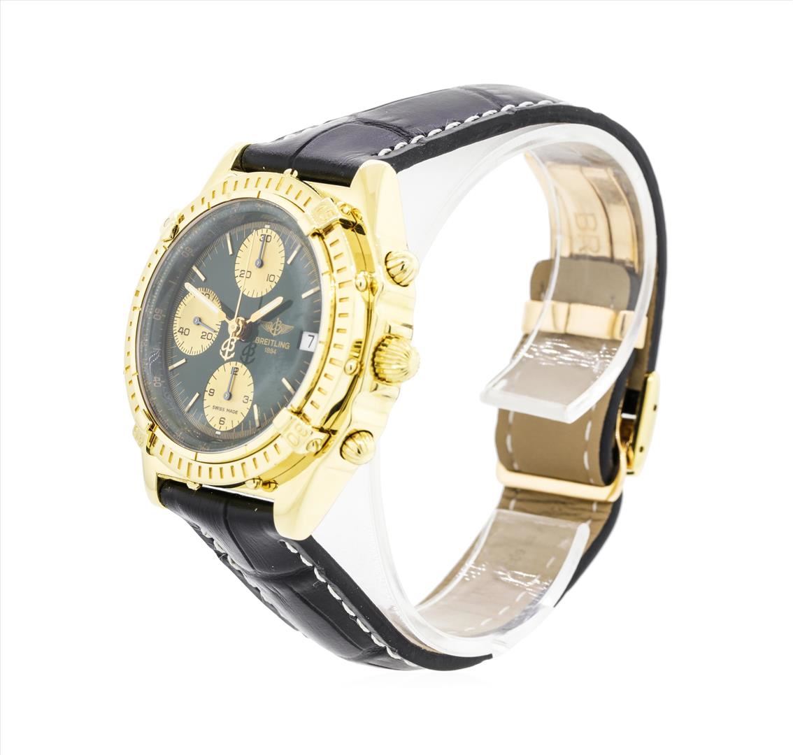 One gents, Breitling Windrider Chronomat wristwatch electronically tested 18KT yellow gold. Case: 40mm diameter, Case Back: engraved with the manufacturers name & logo in high relief, plus information, and ID numbers.Water Resistant: factory specifications state 100 Meters / 330 Feet, Crown: scalloped, set within protective shoulders, Bezel: uni-directional, engraved with indices, completed with four raised stations, Crystal: glare resistant synthetic sapphire.Movement: Automatic, 42 hour power reserve. Breitling signed Dial: Dark Green color, with luminous baton pointed hands, indices & a bordering minute track with bolded five minute intervals, Date Window: three o'clock position.Chronograph Functions: three sub dials; continuous seconds sub dial at the 9 o'clock position, 30 minute totalizer at 12 o'clock, and 12 hour totalizer at 6 o'clock. Bracelet: saddle stitched leather strap. Eight and one half inch length, with a 18KT Yellow gold Breitling concealed deployment clasp. Condition: G-6 Extra Fine. Bright polish finish. Total Weight of Wristwatch 129.60gm. AIG Appraised.