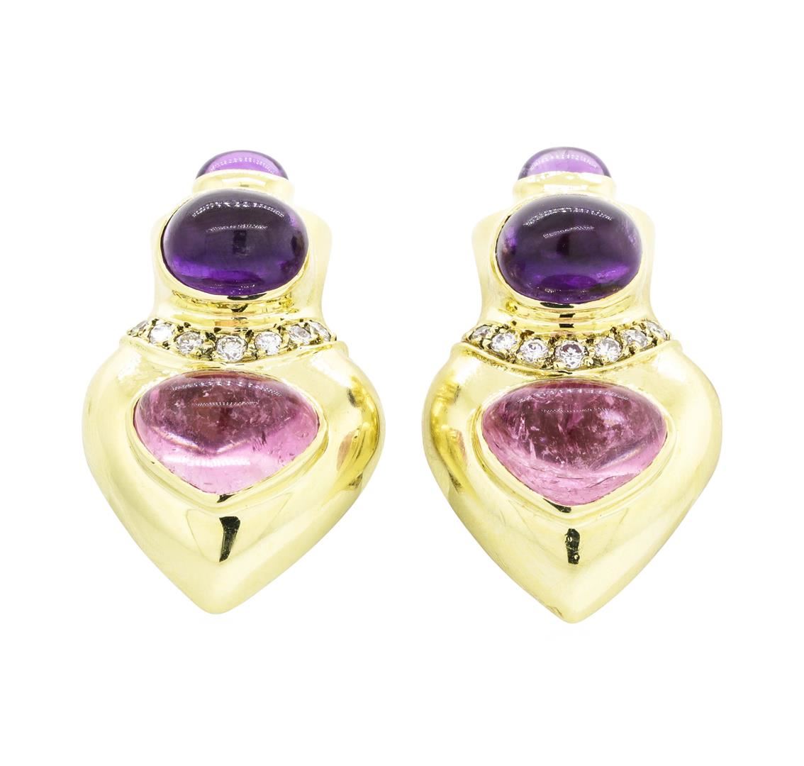 One pair electronically tested 18KT yellow gold lady's combination cast & assembled fashion earrings with Omega clip backs with a bright polish finish. Trademark is Lagos. Identified with markings of '18K'. Condition is new, good workmanship. Containing: Two bezel set oval cabochon cut natural amethysts, measuring 9.00 x 7.00 x 4.60mm, (depth est.) approximate total weight of 4.20ct., clarity is slightly included, dark, moderately strong, purple color, (GIA P 7/4), cut is good. Transmitting light with a minimum of distortion, transparent. Colored gemstones are presumed to have been subjected to commonly used enhancement processes. Graded in the setting. Two bezel set oval cabochon cut natural amethysts, measuring 5.90 x 3.60 x 3.20mm, (depth est.) approximate total weight of 1.00ct., clarity is slightly included, medium, moderately strong, purple color, (GIA P 5/4), cut is good. Transmitting light with a minimum of distortion, transparent. Colored gemstones are presumed to have been subjected to commonly used enhancement processes. Graded in the setting. Two bezel set pear cabochon cut natural pink tourmalines, measuring 11.20 x 8.00 x 5.80mm, (depth est.) approximate total weight of 8.60ct., clarity is moderately included, light, moderately strong, slightly purplish red color, (GIA slpR 3/4), cut is good. Transmitting light somewhat diffusely, transparent to translucent. Colored gemstones are presumed to have been subjected to commonly used enhancement processes. Graded in the setting. Fourteen prong set round brilliant cut diamonds, measuring 2.00 - 1.70 x 1.15mm (depth est.) approximate total weight of 14 Stones = 0.34ct. Graded in the setting. Color G - H Clarity VS-1 to VS-2 Cut Very Good. Total Weight of Colored Stones 13.80ct.. Total Weight of Diamonds 0.34ct.. Total Weight of Earrings 19.00gm GAS Appraised.