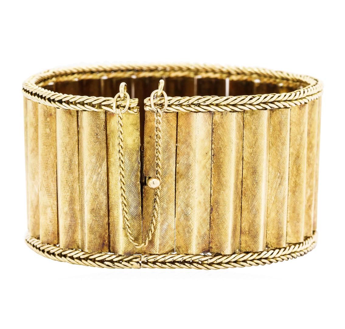 One wide bangle bracelet featuring: 18KT yellow gold weighing 58.4 grams. The bracelet measures approximately six and a half inches in length and 32 millimeters wide.