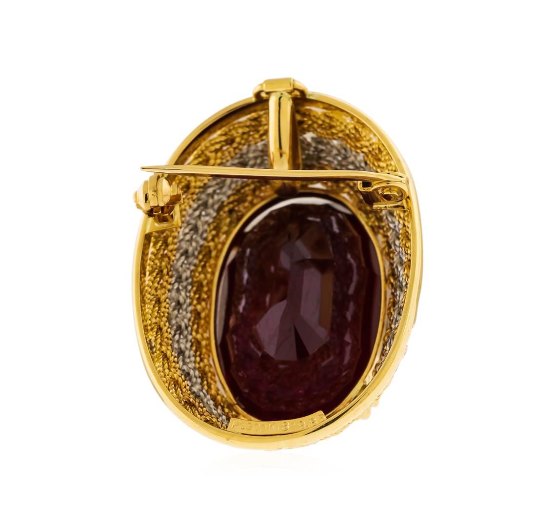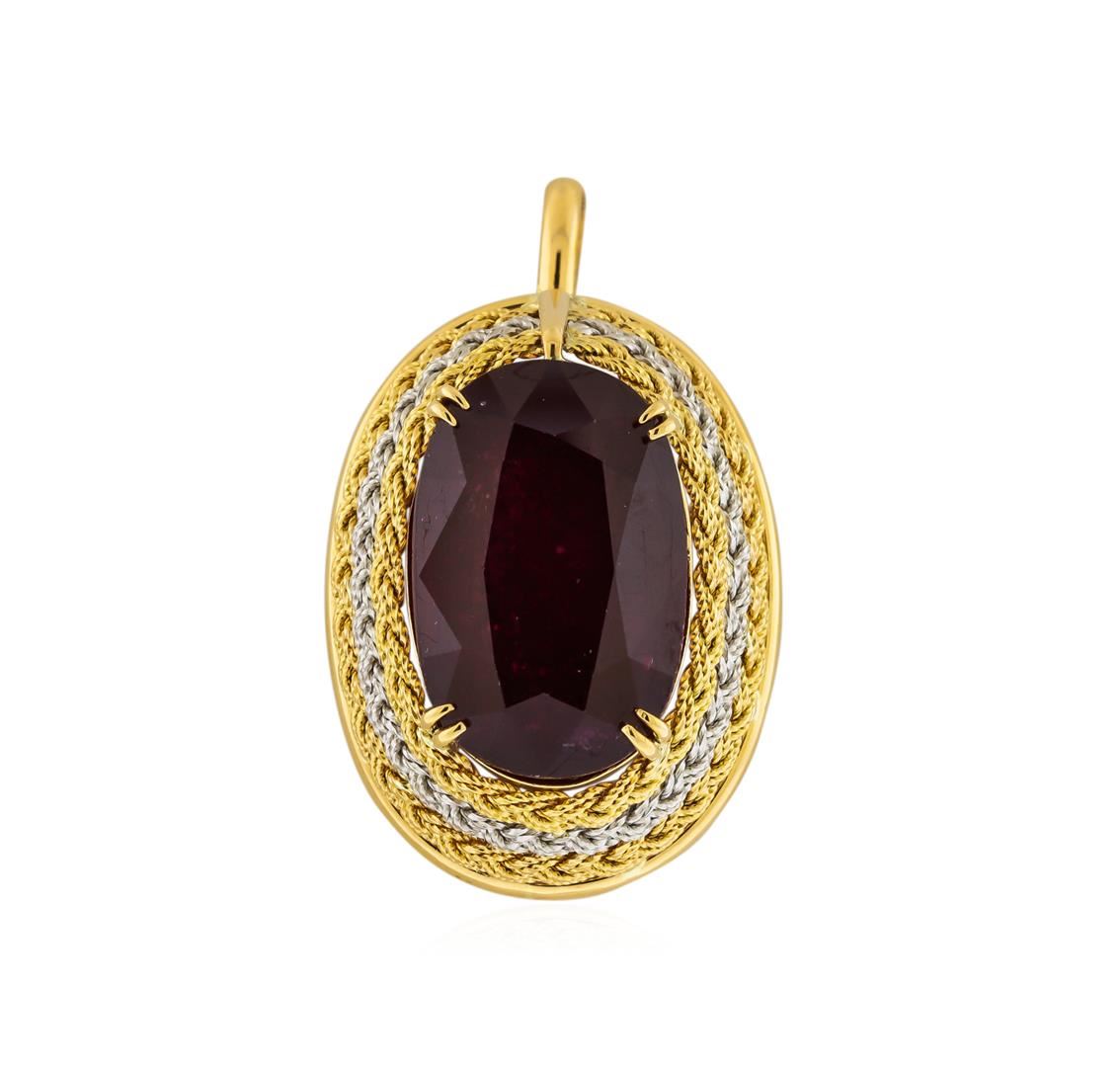 One electronically tested 18KT yellow gold and platinum ladies cast & assembled ruby solitaire pendant/brooch. The pendant/brooch features a ruby set within tiered yellow gold and platinum braided bezels, completed by a yellow gold hinged bail and a horizontally placed pin. Bright and patterned finish. Identified with markings of "PT900 K18". Condition is good. Containing: One prong set oval mixed cut natural ruby, measuring 21.55 x 14.05 x 10.35mm, 15%. bulge factor, approximate weight of 30.77ct., clarity is heavily included, type II, dark, very slightly brownish, slightly purplish red color, (GIA slpR 7/3), cut is good. Transmitting light somewhat diffusely, transparent to translucent. Naturally occurring internal & externalcharacteristics are present. Indications of laboratory high temperature heat treatment, withglass & flux additives. Graded in the setting. Ruby has a low tolerance to rhodium plating,repolishing the surface, & ultrasonic cleaning.Total Weight of Colored Stones 30.77ct. Total Weight of Pendant/Brooch 14.68gm. AIG Appraised at $7,465.00.