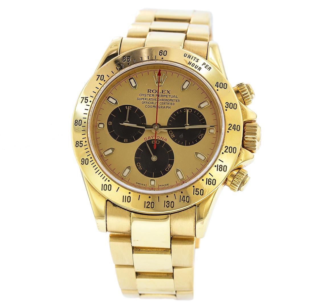 Gent's 18K Yellow Gold Rolex Daytona Cosmograph # 116528. Champagne Paul Newman Dial with Baton Hour Markers, Black Chronograph Subdials. 18K Yellow Gold Oyster Flip lock Bracelet with Clasp.