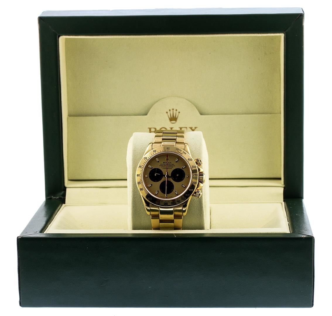 Gent's 18K Yellow Gold Rolex Daytona Cosmograph # 116528. Champagne Paul Newman Dial with Baton Hour Markers, Black Chronograph Subdials. 18K Yellow Gold Oyster Flip lock Bracelet with Clasp.