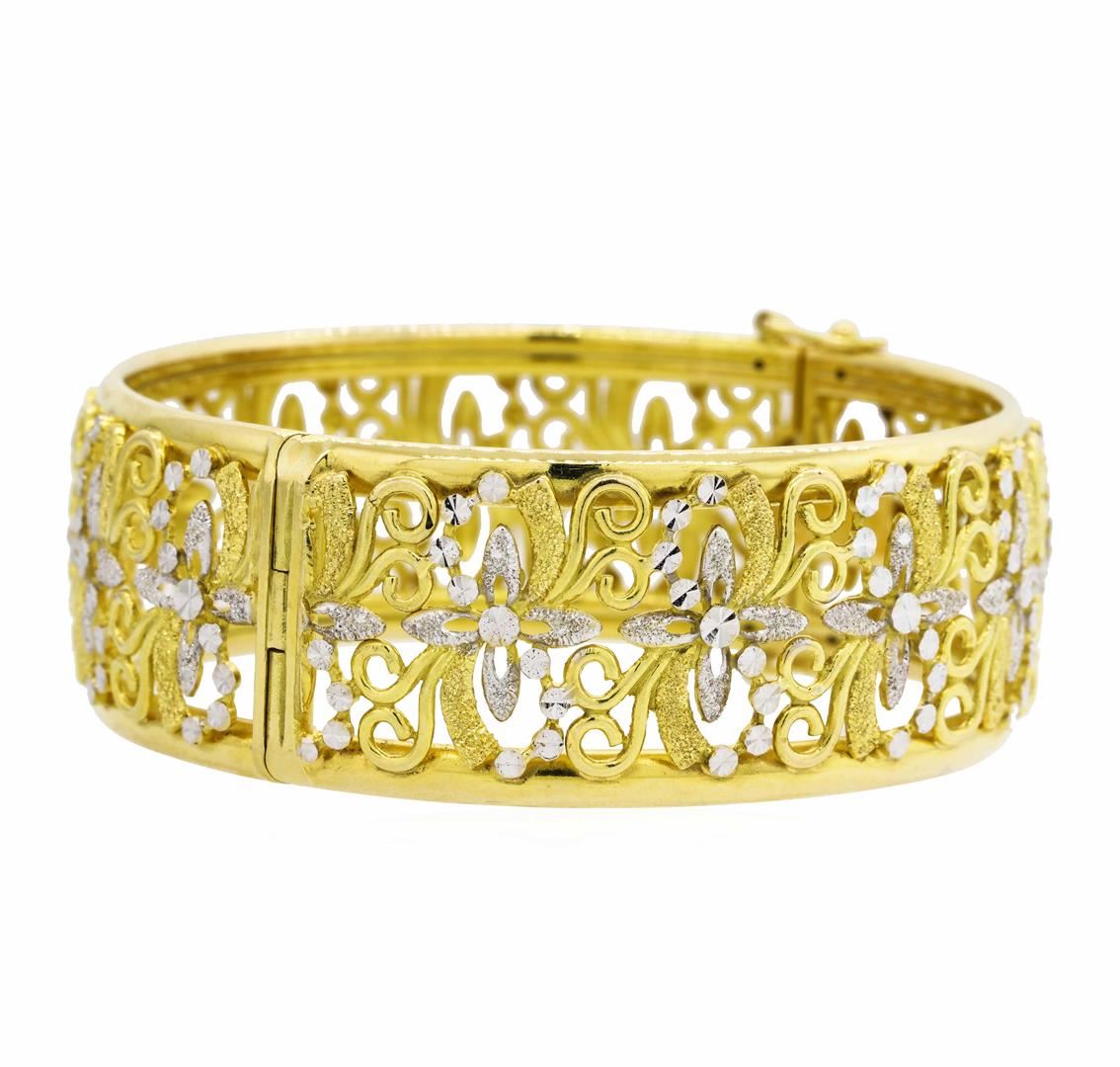 One bangle bracelet featuring: 18KT yellow gold with rhodium plating weighing 40.4 grams. The bracelet measures approximately six and a half inches in circumference.