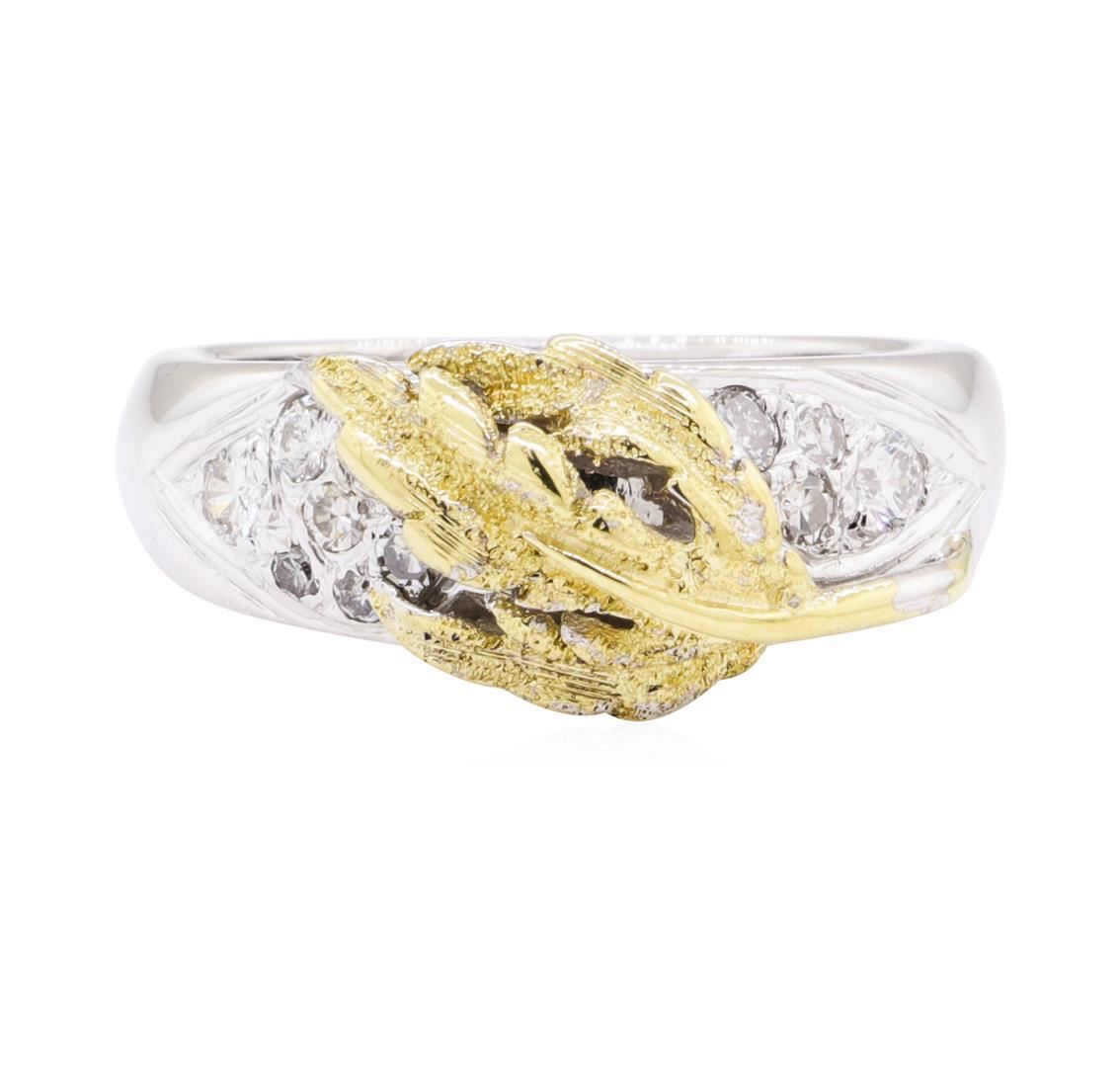 One leaf overlay ring featuring: 18KT yellow and white gold 6.8 grams containing diamonds weighing 0.40ctw. The ring is a size 6.5.
