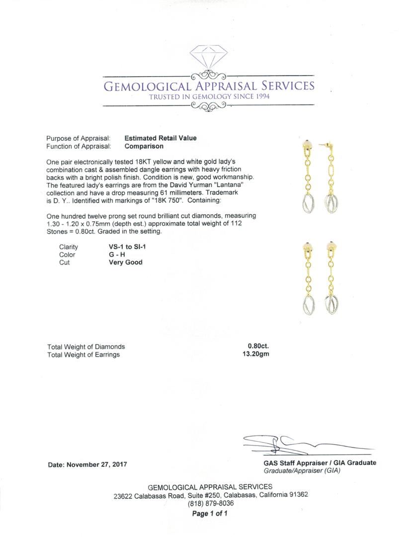 One pair electronically tested 18KT yellow and white gold lady's combination cast & assembled dangle earrings with heavy friction backs with a bright polish finish. The featured lady's earrings are from the David Yurman 'Lantana' collection and have a drop measuring 61 millimeters. Trademark is D. Y. Identified with markings of '18K 750'. Condition is new, good workmanship. Containing: One Hundred Twelve prong set round brilliant cut diamonds, measuring 1.30 - 1.20 x 0.75mm (depth est.) approximate total weight of 112 Stones = 0.80ct. Graded in the setting. Color G - H Clarity VS-1 to SI-1 Cut Very Good. Total Weight of Diamonds 0.80ct.. Total Weight of Earrings 13.20gm. GAS Appraised.
