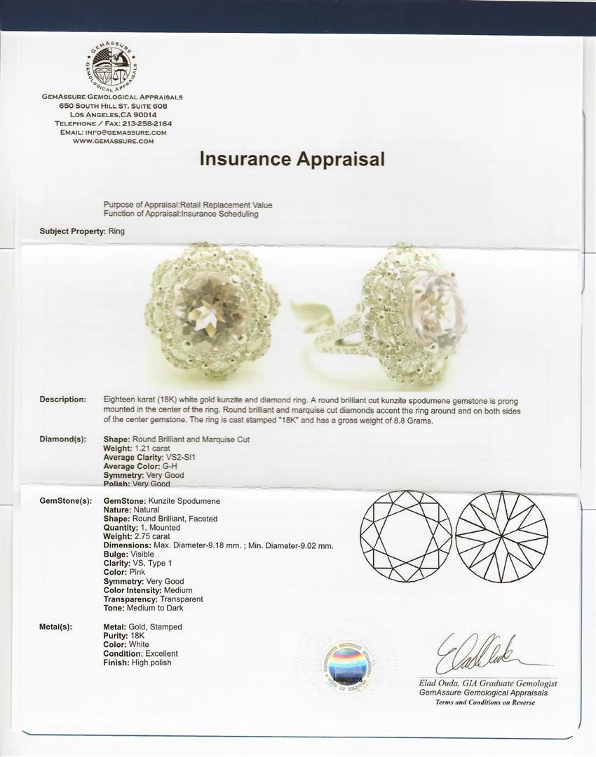 Eighteen karat ( 18K) white gold kunzite and diamond ring. A round brilliant cut kunzite spodumene gemstone, weighing approximately 2.75cts, is prong mounted in center of the ring. Round brilliant and marquise cut diamonds accent the ring around and on both sides of the center gemstone. The is cast stamped "18K" has a gross weight of 8.8 grams. GGA Appraised.