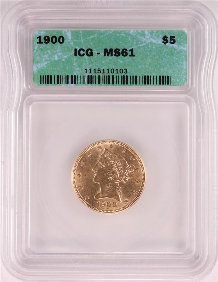 One 1900 $5 Liberty Head Half Eagle Coin ICG MS61.
