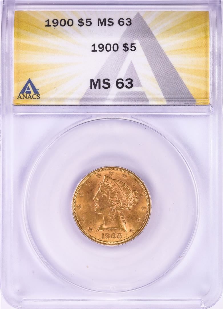 One 1900 $5 Liberty Head Half Eagle Gold Coin ANACS MS63. ANACS Certified.