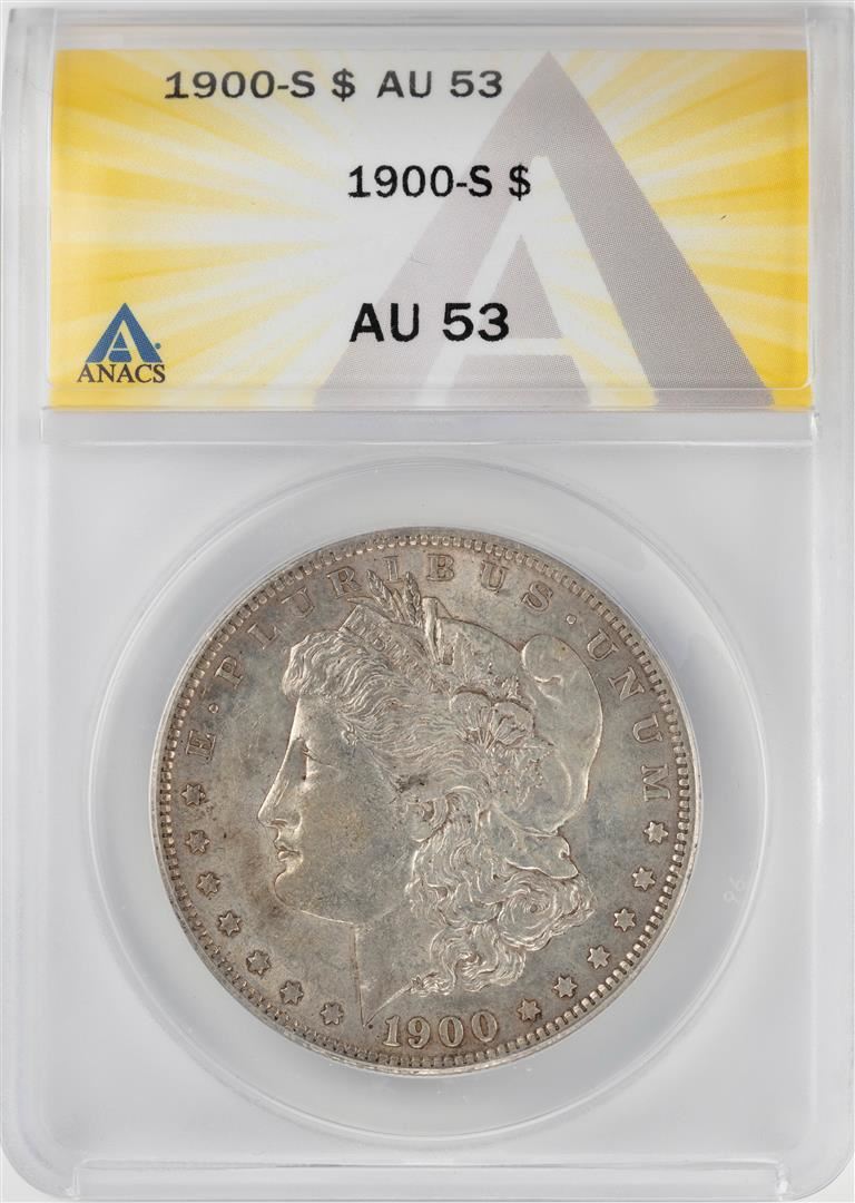 One 1900-S $1 Morgan Silver Dollar Coin ANACS AU53. ANACS Certified.