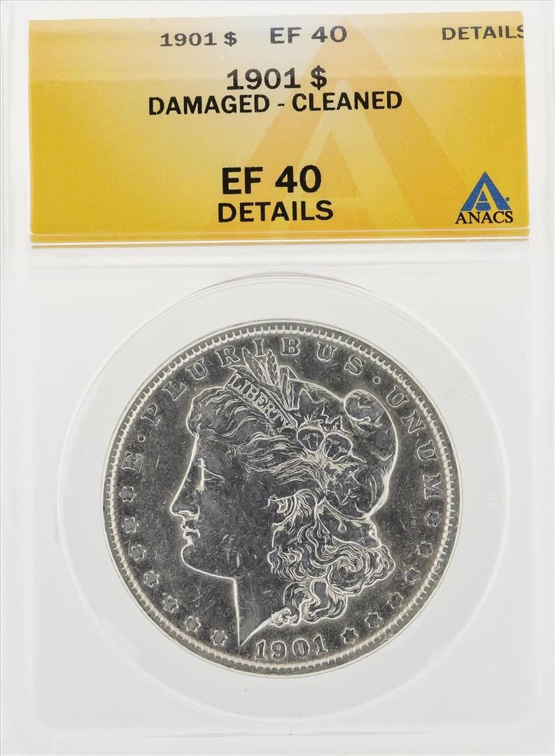 One 1901 $1 Morgan Silver Dollar Coin Damaged Cleaned ANACS EF40 Details. ANACS Certified.