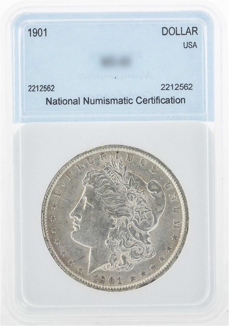 One 1901 $1 Morgan Silver Dollar Coin. This coin has been graded by "National Numismatic Certification" company. However, since it is not one of the main numismatic certification companies that we currently recognize, we purposely blurred out the assigned grade of the coin to avoid any confusion. We encourage each bidder to make their own determination as to the grade & value of the coin.