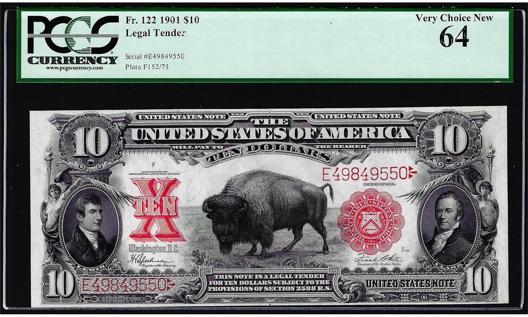 One 1901 $10 Bison Legal Tender Note Fr.122 PCGS Very Choice New 64. PCGS Graded.