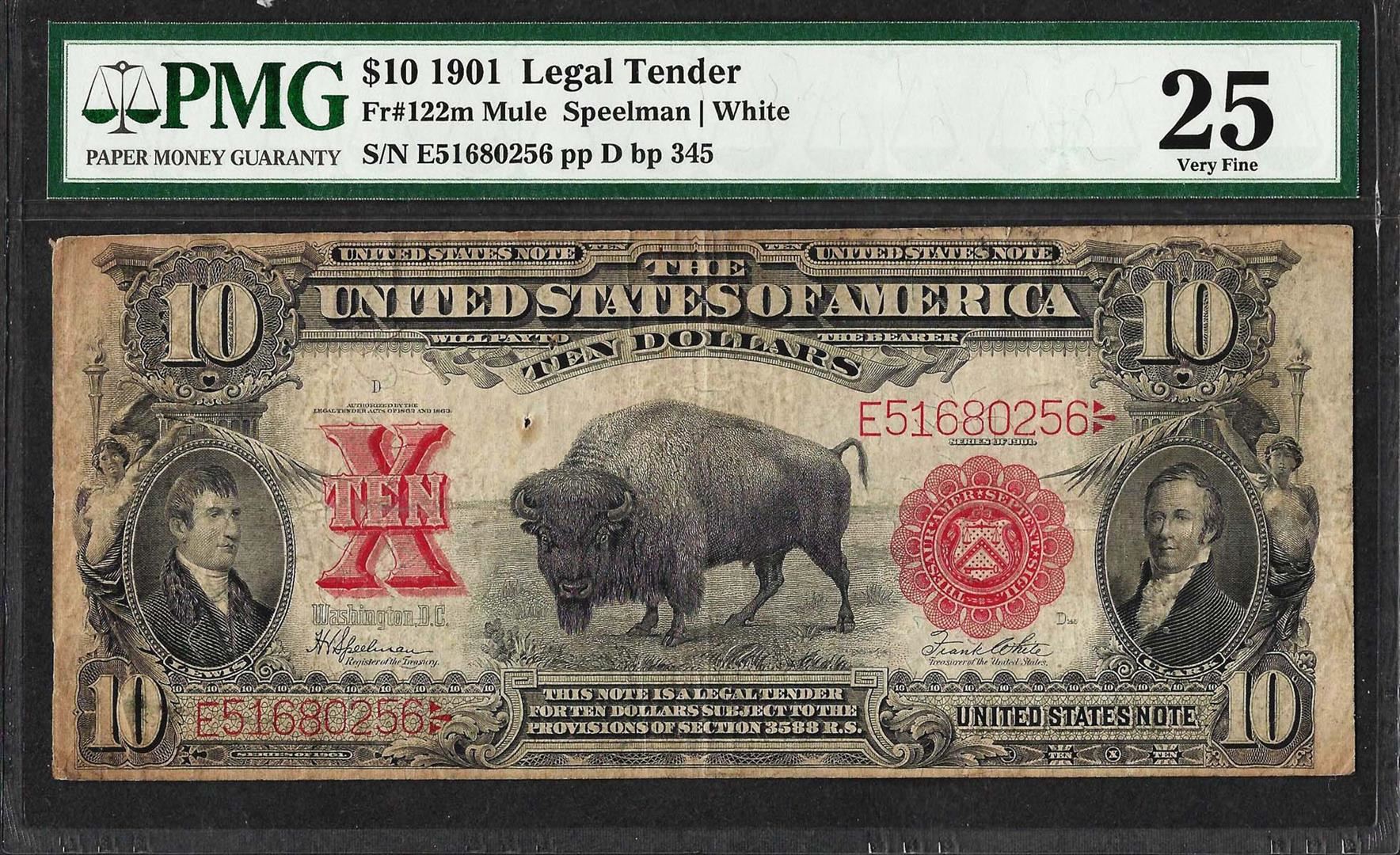 One 1901 $10 Bison Legal Tender Note Fr.122m PMG Very Fine 25. PMG Certified.