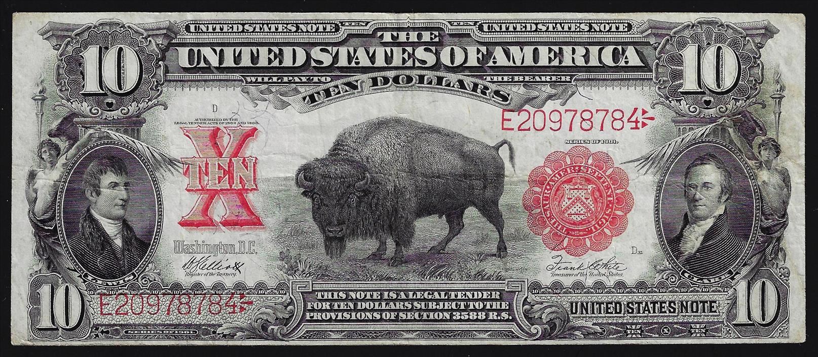 One 1901 $10 Bison Legal Tender U.S. Currency Note.