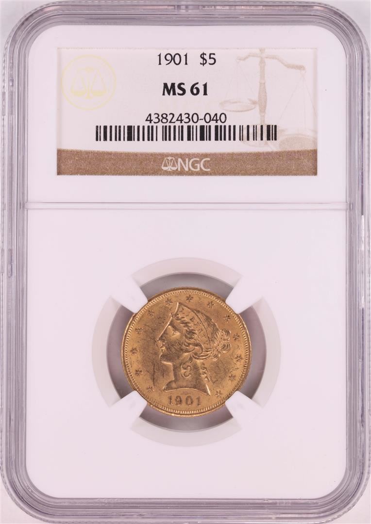 One 1901 $5 Liberty Head Half Eagle Gold Coin NGC MS61. NGC Certified.