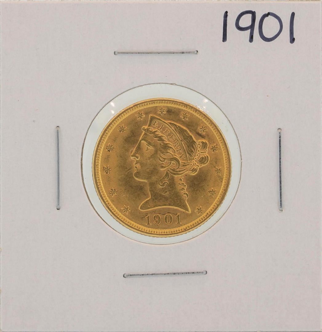 One 1901 $5 Liberty Head Half Eagle Gold Coin.