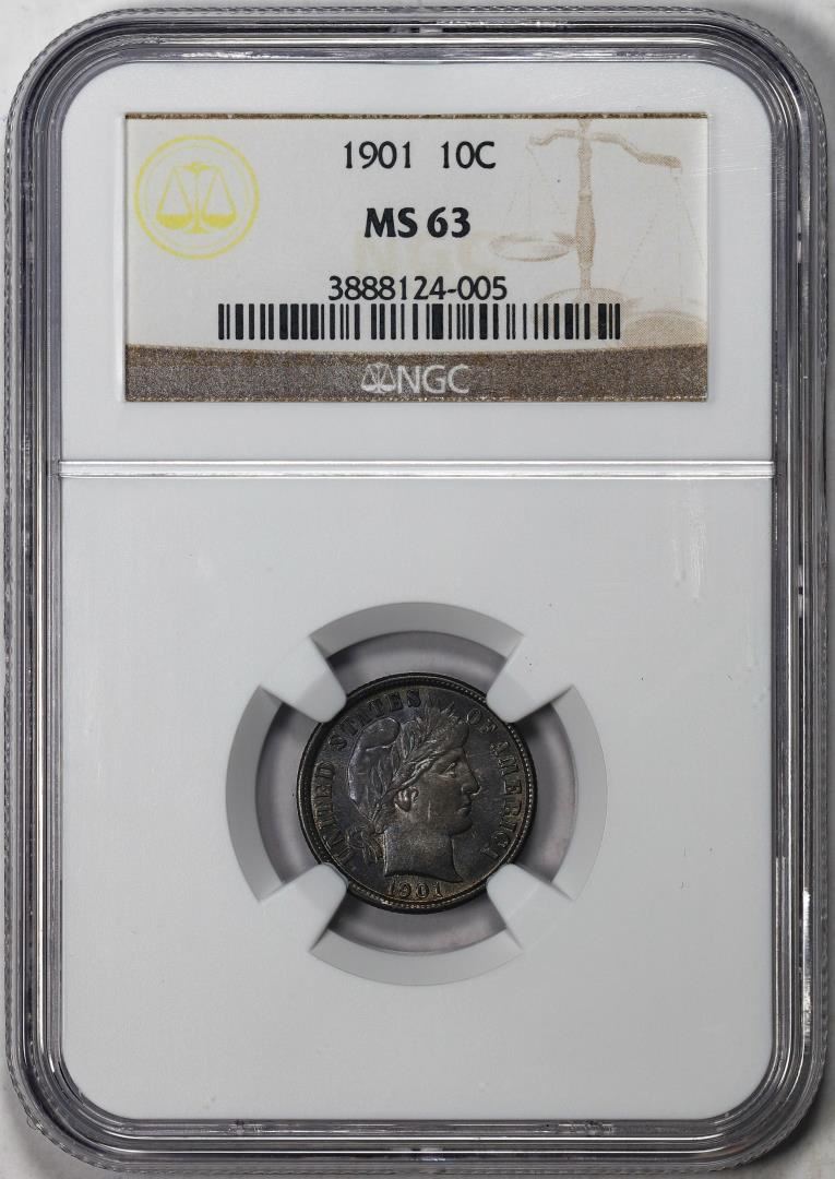 One 1901 Barber Dime Coin NGC MS63. NGC Certified.