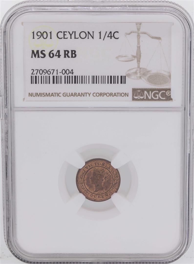 One 1901 Ceylon 1/4 Cent Coin NGC MS64RB. NGC Certified.