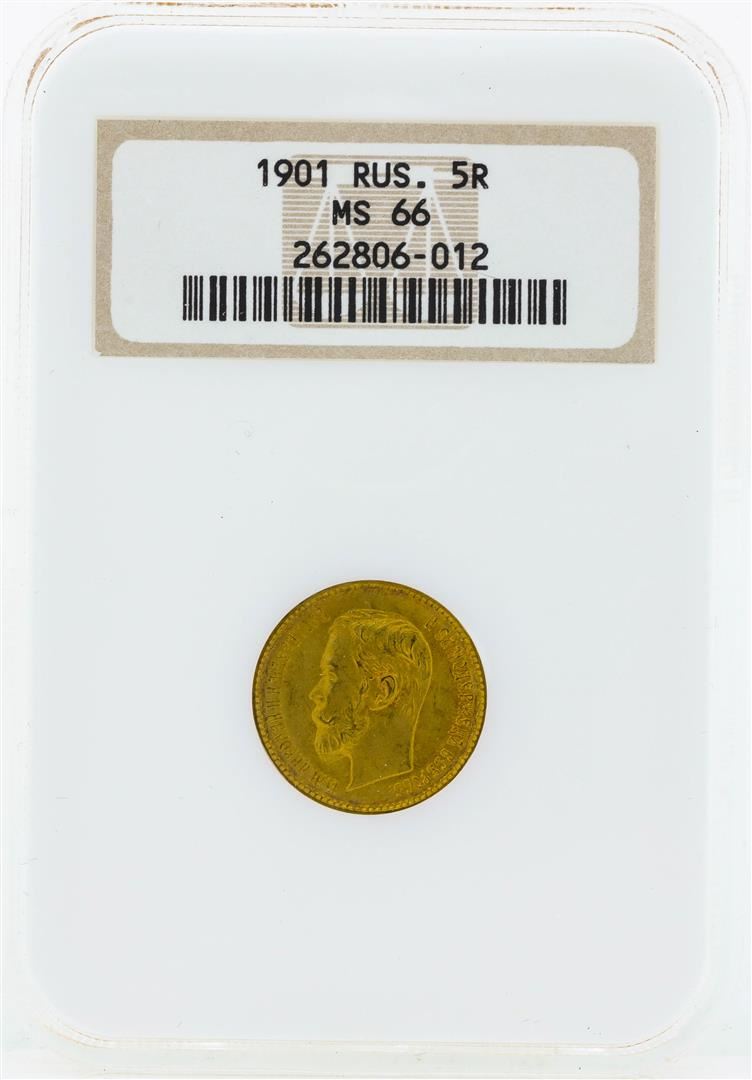 One 1901 Russia 5 Roubles Gold Coin NGC MS66. NGC Certified.