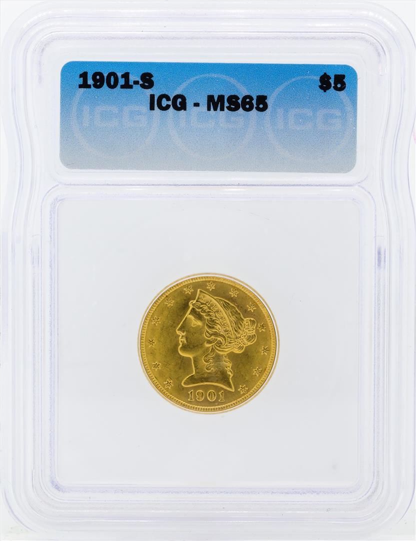 One 1901-S $5 Liberty Head Half Eagle Gold Coin ICG MS65. ICG Certified.