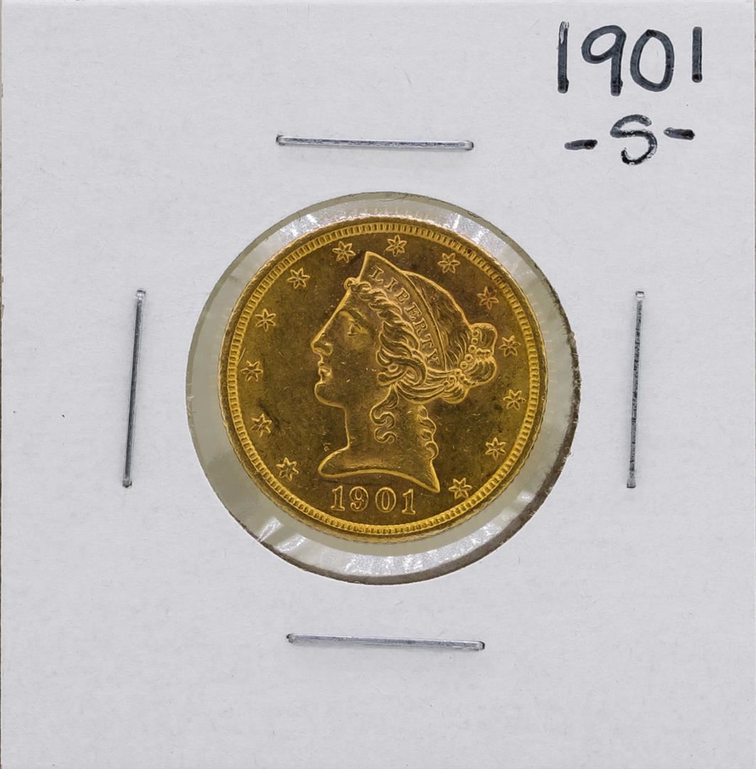 One 1901-S $5 Liberty Head Half Eagle Gold Coin.